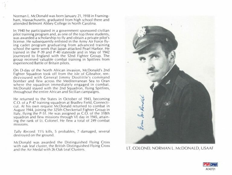 NORMAN MCDONALD SIGNED 8X10 (D) PSA DNA AC42721 WWII ACE 11.5 KILLS COLLECTIBLE MEMORABILIA