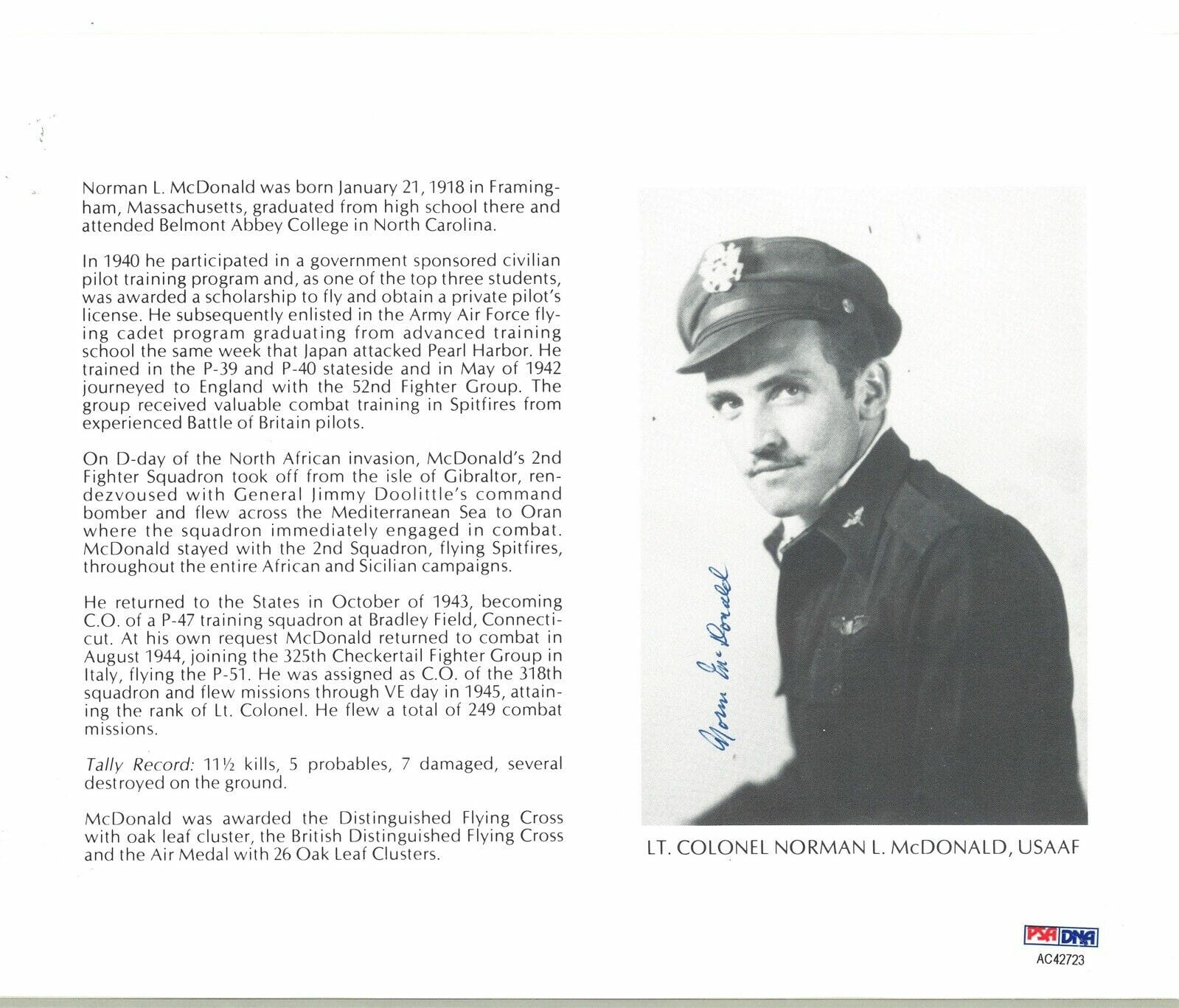NORMAN MCDONALD SIGNED 8X10 (D) PSA DNA AC42723 WWII ACE 11.5 KILLS COLLECTIBLE MEMORABILIA