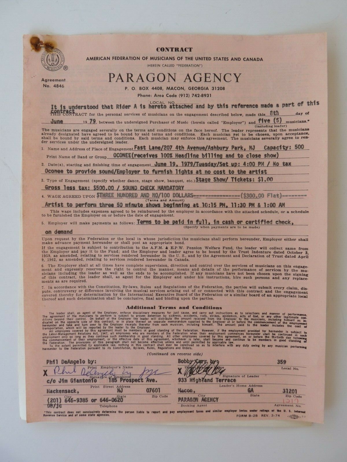 OCONEE BAND DUAL SIGNED 6-8-79 LIVE PERFORMANCE CONCERT CONTRACT & RIDER COLLECTIBLE MEMORABILIA