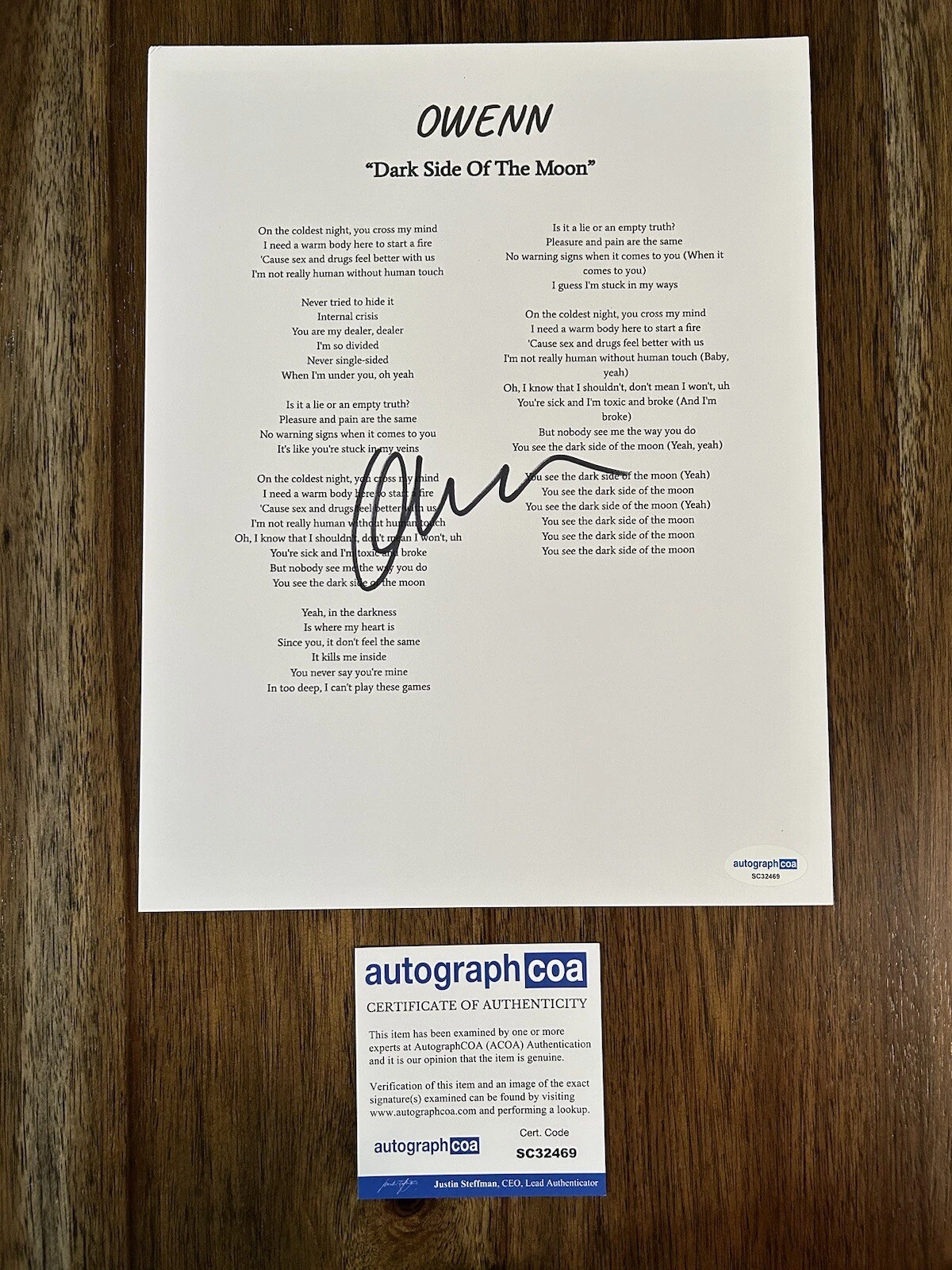 OWENN POP SINGER SIGNED AUTOGRAPHED ‘DARK SIDE OF THE MOON’ LYRIC SHEET ACOA COLLECTIBLE MEMORABILIA
