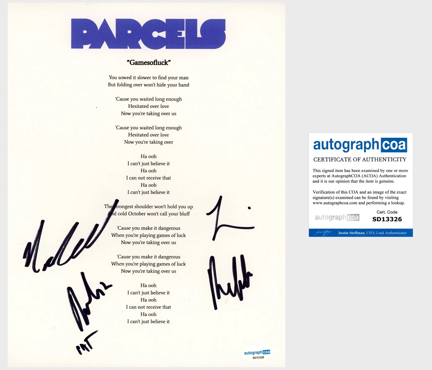‘PARCELS’ FULL BAND SIGNED LYRIC SHEET ‘GAMESOFLUCK’ PAT HETHERINGTON +4 COLLECTIBLE MEMORABILIA