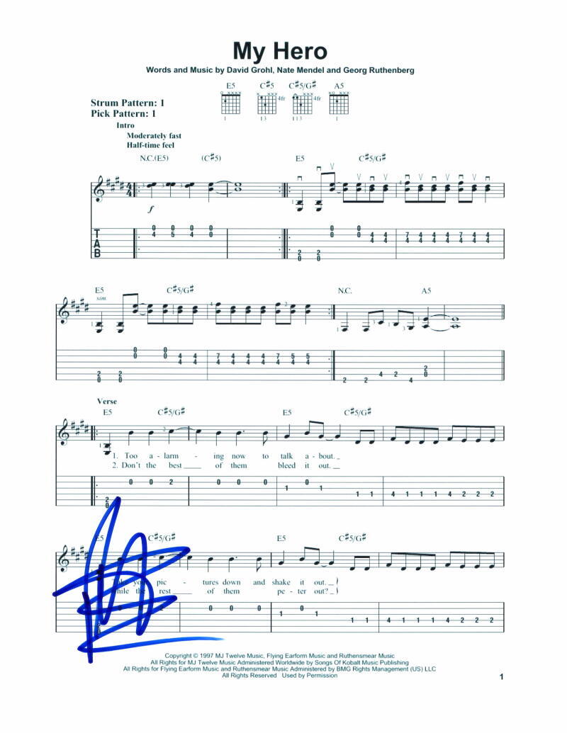 PAT SMEAR SIGNED AUTOGRAPH MY HERO SHEET MUSIC – FOO FIGHTERS, SONIC HIGHWAYS COLLECTIBLE MEMORABILIA
