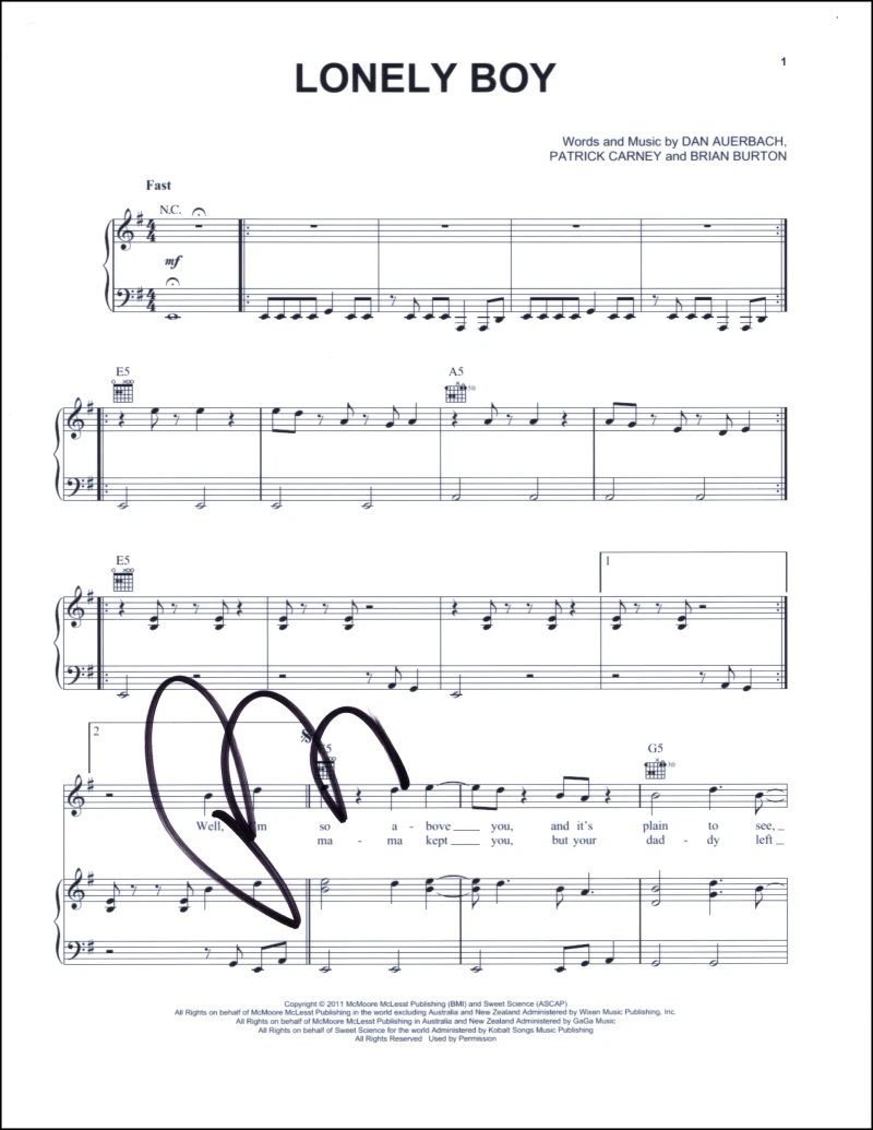 PATRICK CARNEY THE BLACK KEYS SIGNED AUTOGRAPH LONELY BOY SHEET MUSIC EL CAMINO COLLECTIBLE MEMORABILIA