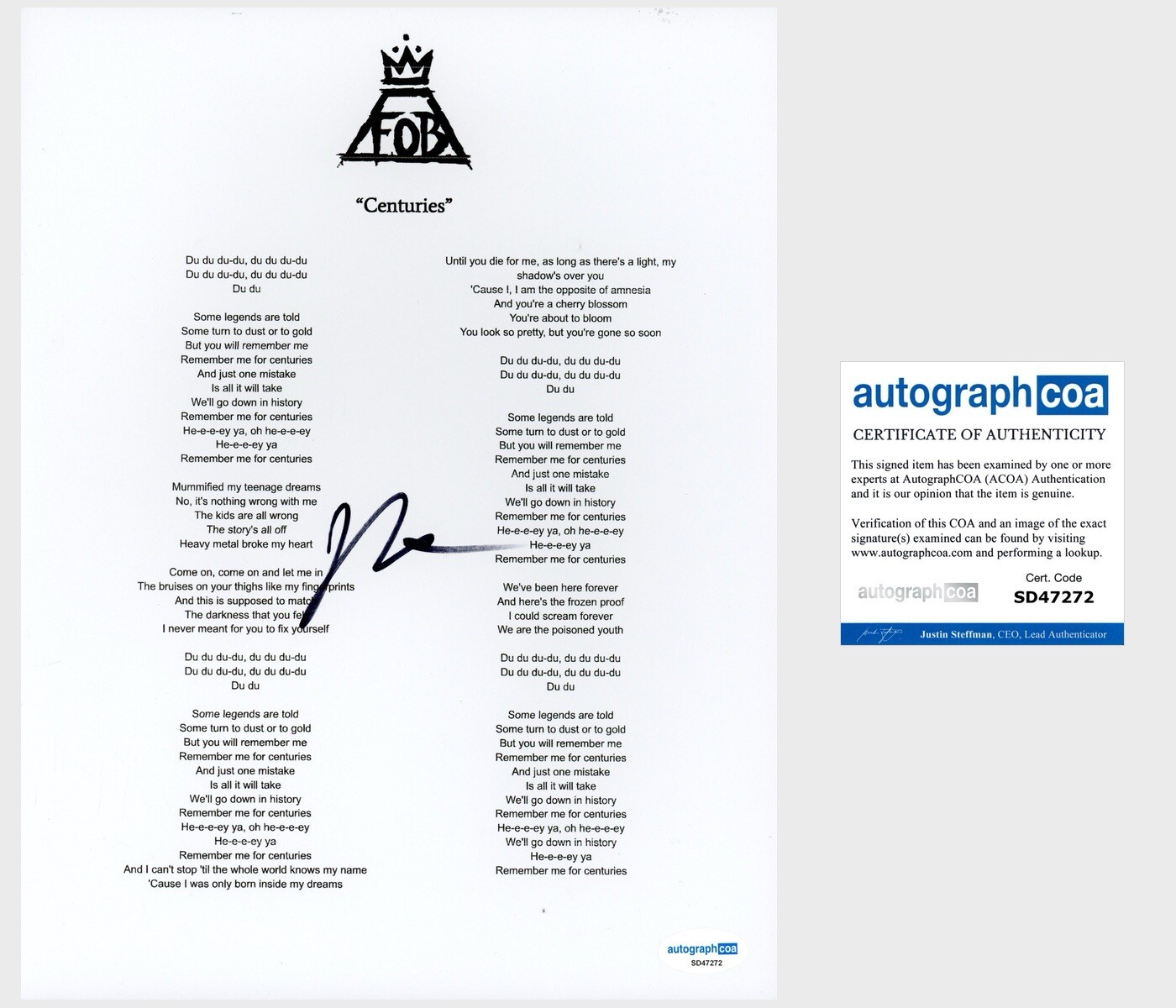 PATRICK STUMP ‘FALL OUT BOY’ BAND SIGNED ‘CENTURIES’ LYRIC SHEET ACOA COLLECTIBLE MEMORABILIA