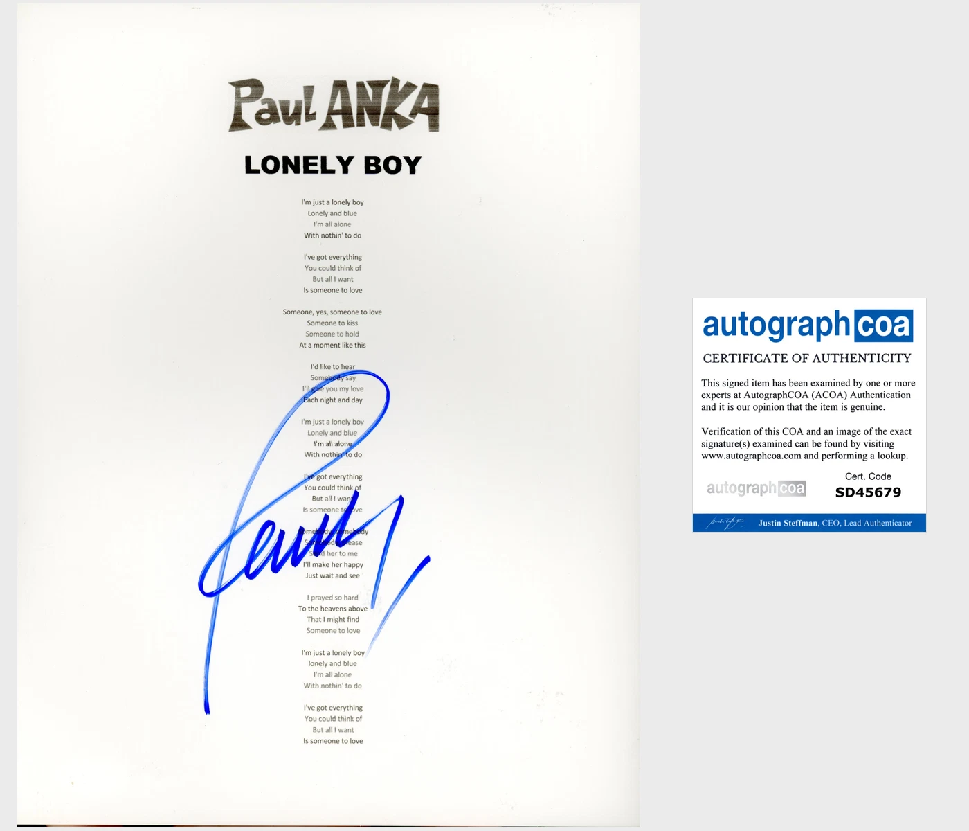 PAUL ANKA SIGNED LONELY BOY LYRICS SHEET W/PROOF & AUTOGRAPH COA ACOA COLLECTIBLE MEMORABILIA