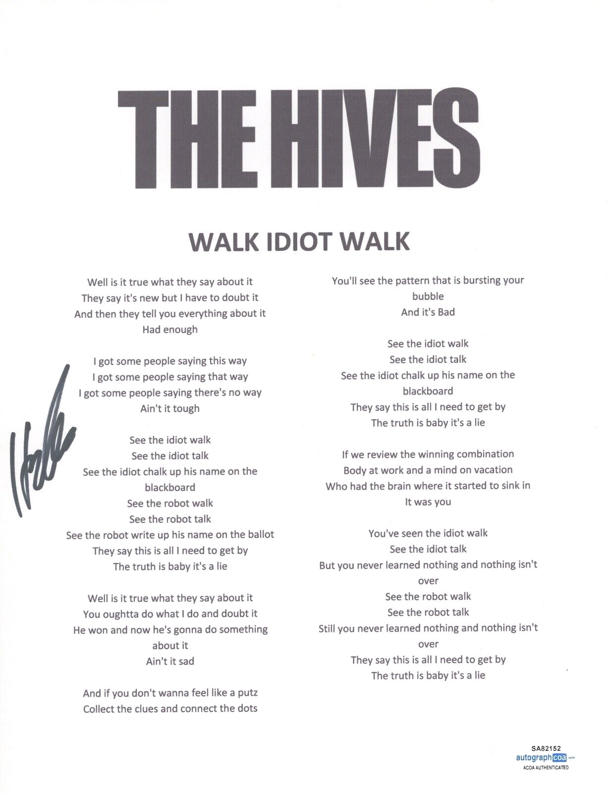 PELLE ALMQVIST SIGNED AUTOGRAPHED THE HIVES WALK IDIOT WALK LYRIC SHEET ACOA COA COLLECTIBLE MEMORABILIA