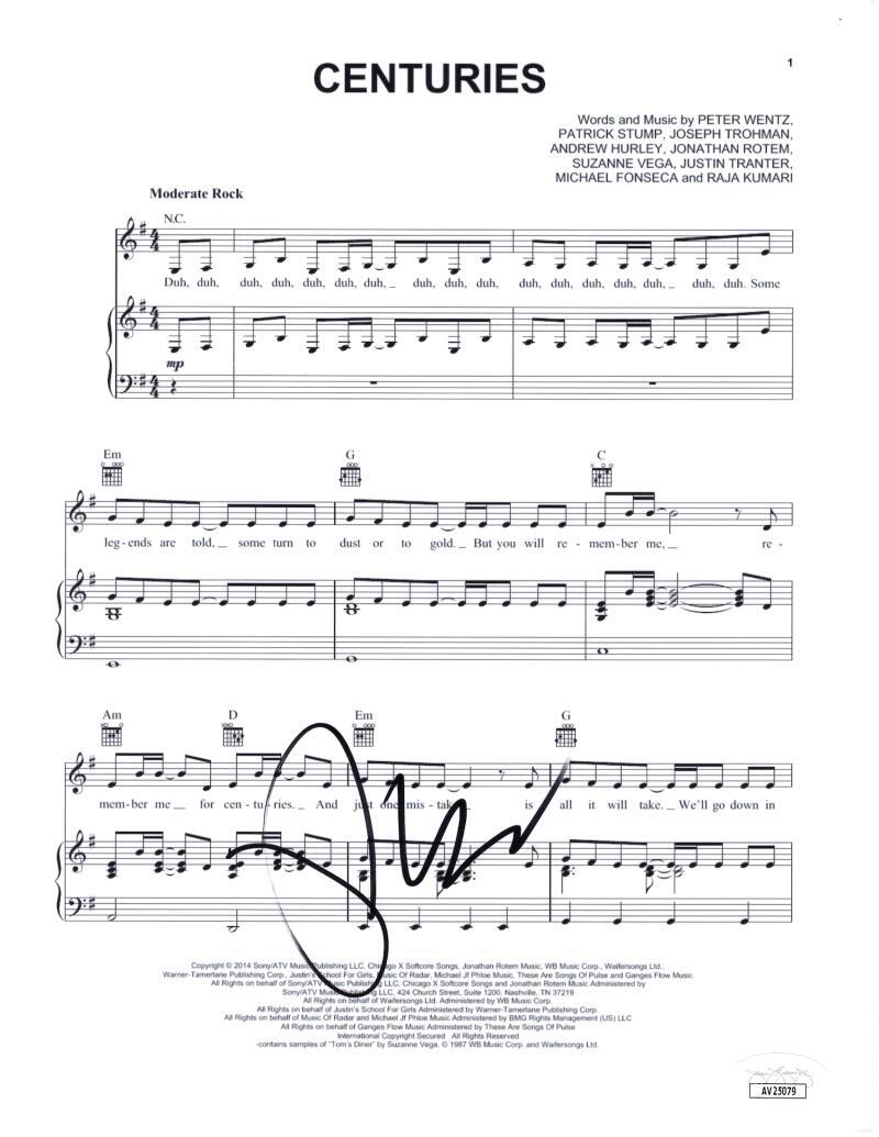 PETE WENTZ OF FALL OUT BOY SIGNED AUTOGRAPH CENTURIES SHEET MUSIC W/ JSA COA COLLECTIBLE MEMORABILIA