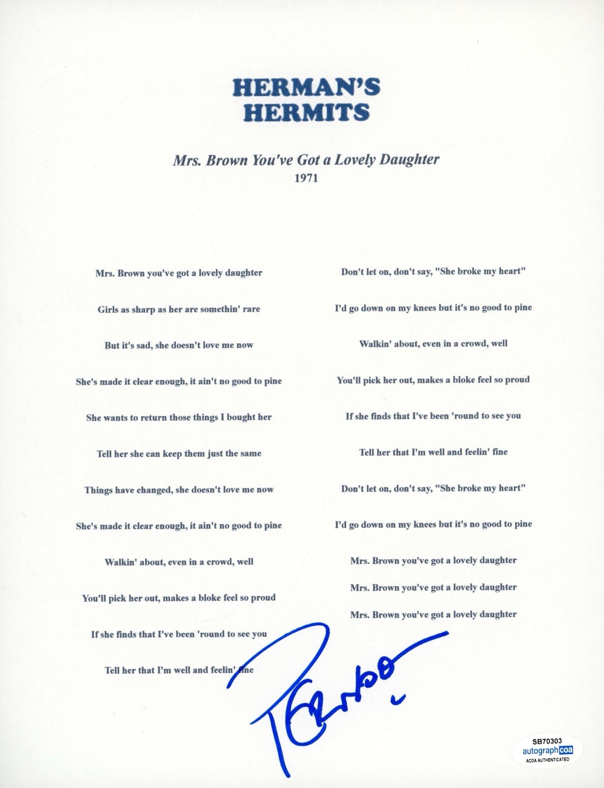 PETER NOONE HERMANS HERMITS SIGNED AUTOGRAPH LYRIC SHEET ACOA COLLECTIBLE MEMORABILIA