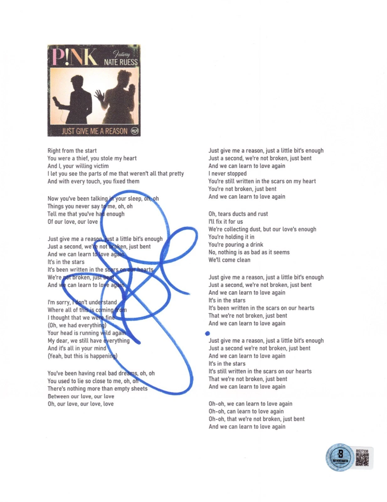 PINK SIGNED JUST GIVE ME A REASON SHEET MUSIC AUTHENTIC AUTOGRAPH BECKETT COLLECTIBLE MEMORABILIA