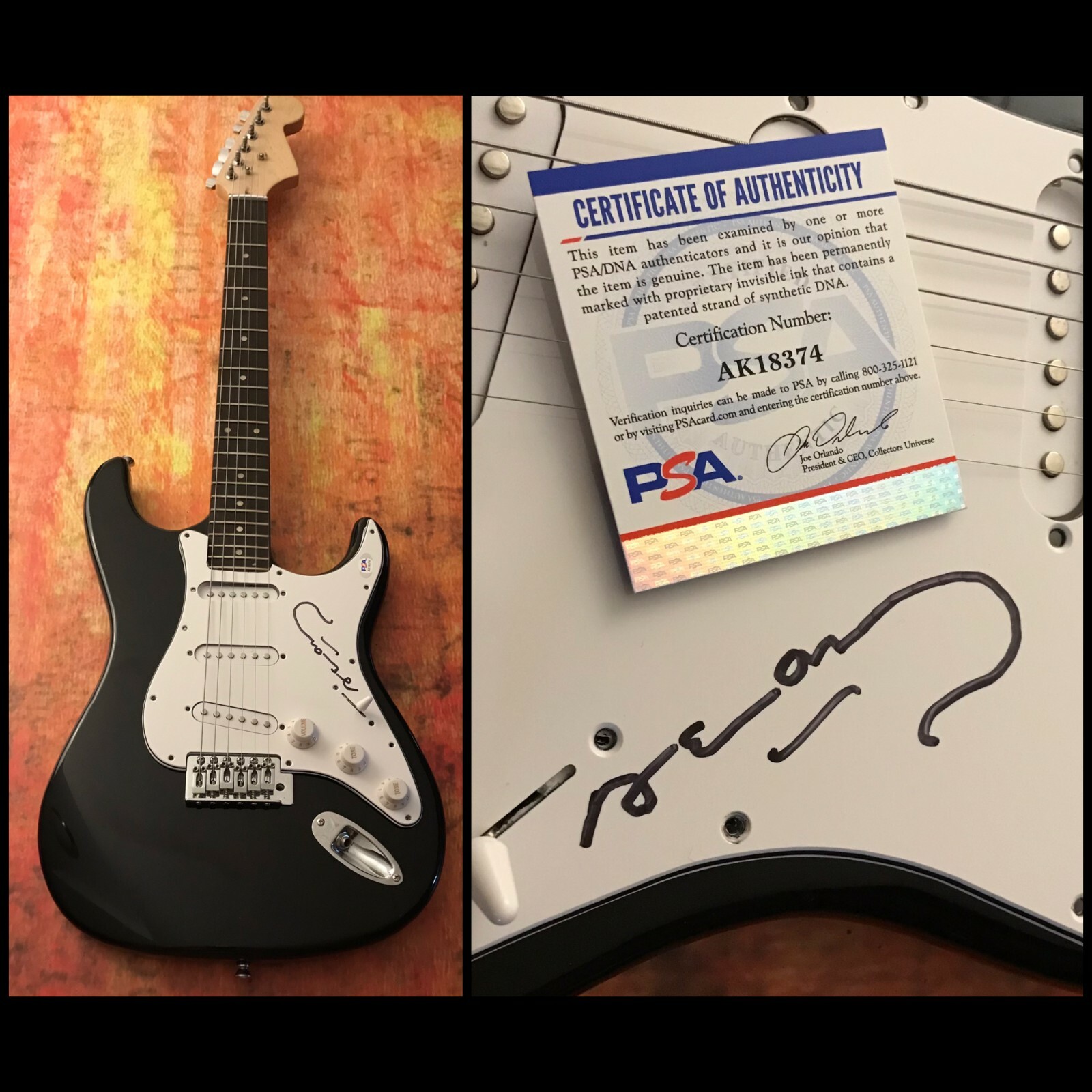 This hand-signed guitar is verified 100% genuine by professional authenticators and includes a Certificate of Authenticity card. A numbered tamper-proof hologram is attached to the item so you can verify its authenticity on our website at your convenience.