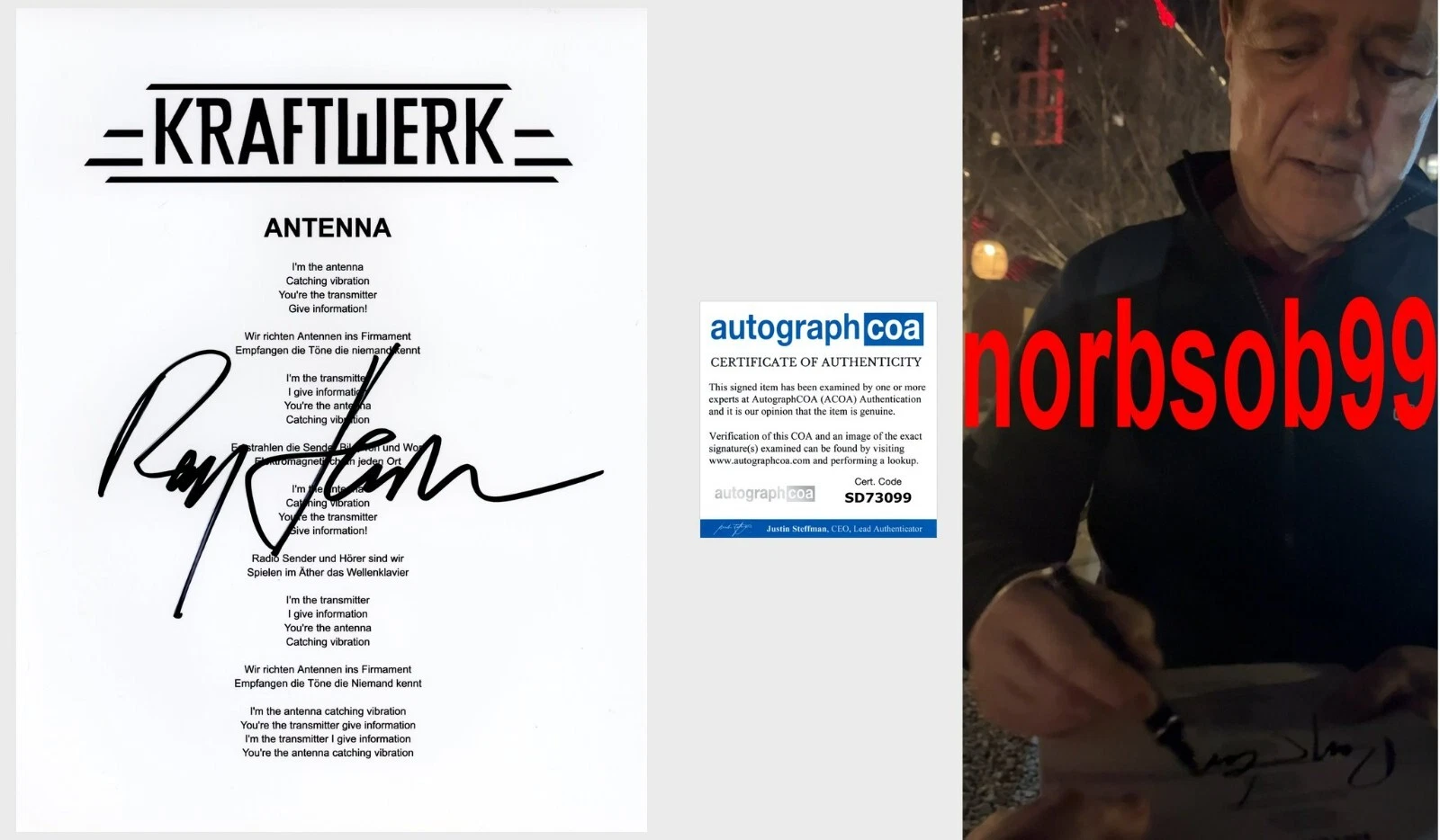 RALF HUTTER KRAFTWERK SIGNED ANTENNA LYRICS SHEET W/EXACT PROOF & AUTOGRAPH COA COLLECTIBLE MEMORABILIA
