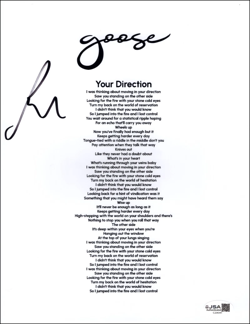 RICK MITAROTONDA GOOSE SIGNED AUTOGRAPH YOUR DIRECTION LYRIC SHEET MUSIC JSA COA COLLECTIBLE MEMORABILIA