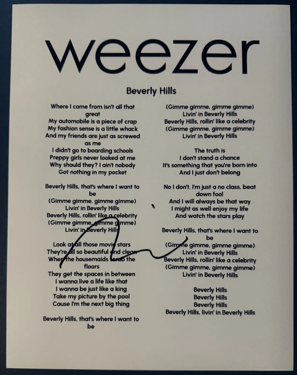 RIVERS CUOMO SIGNED LYRIC SHEET WEEZER SINGER BEVERLY HILLS AUTOGRAPH COA COLLECTIBLE MEMORABILIA