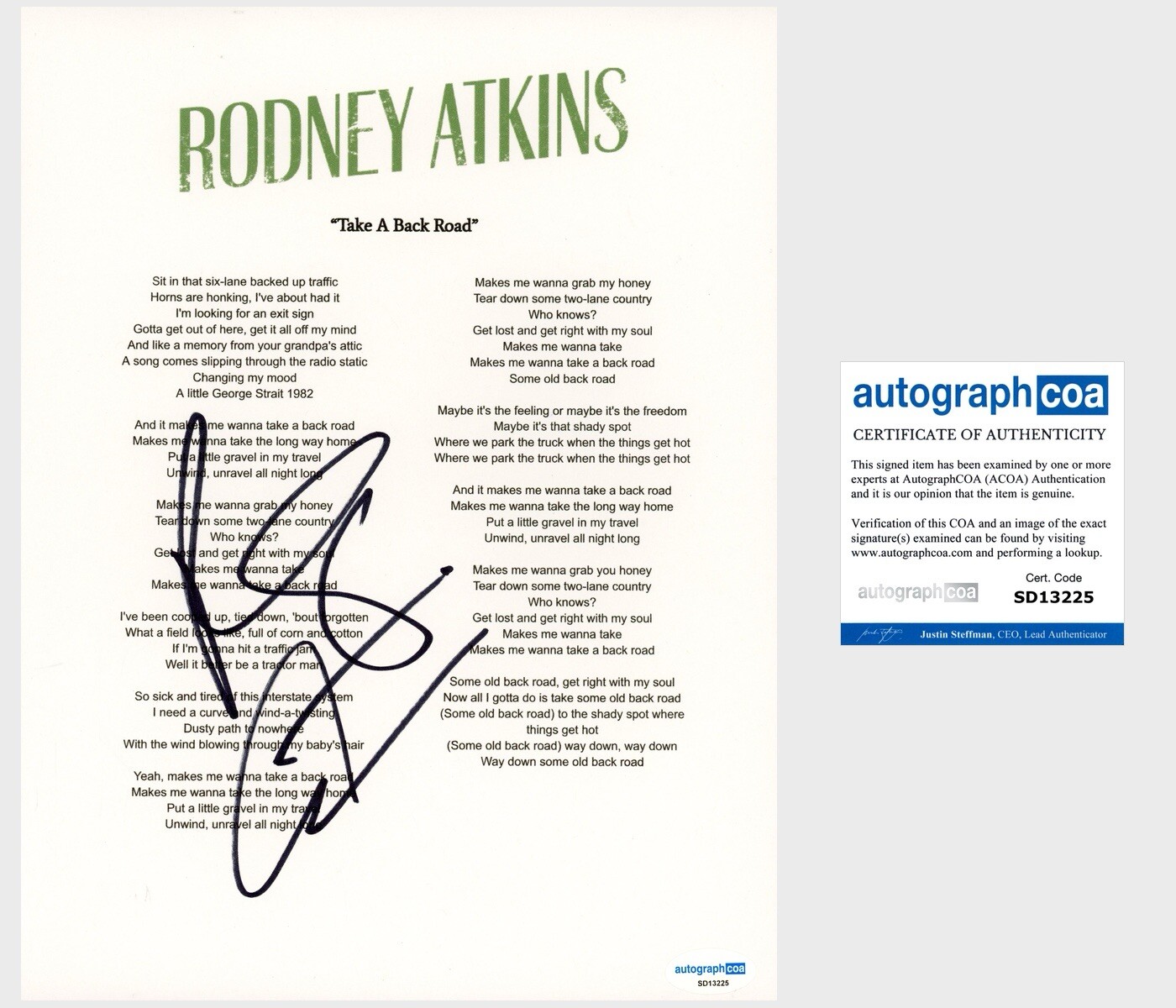 ‘RODNEY ATKINS’ SIGNED LYRIC SHEET ‘TAKE A BACK ROAD’ ACOA PROOF COLLECTIBLE MEMORABILIA