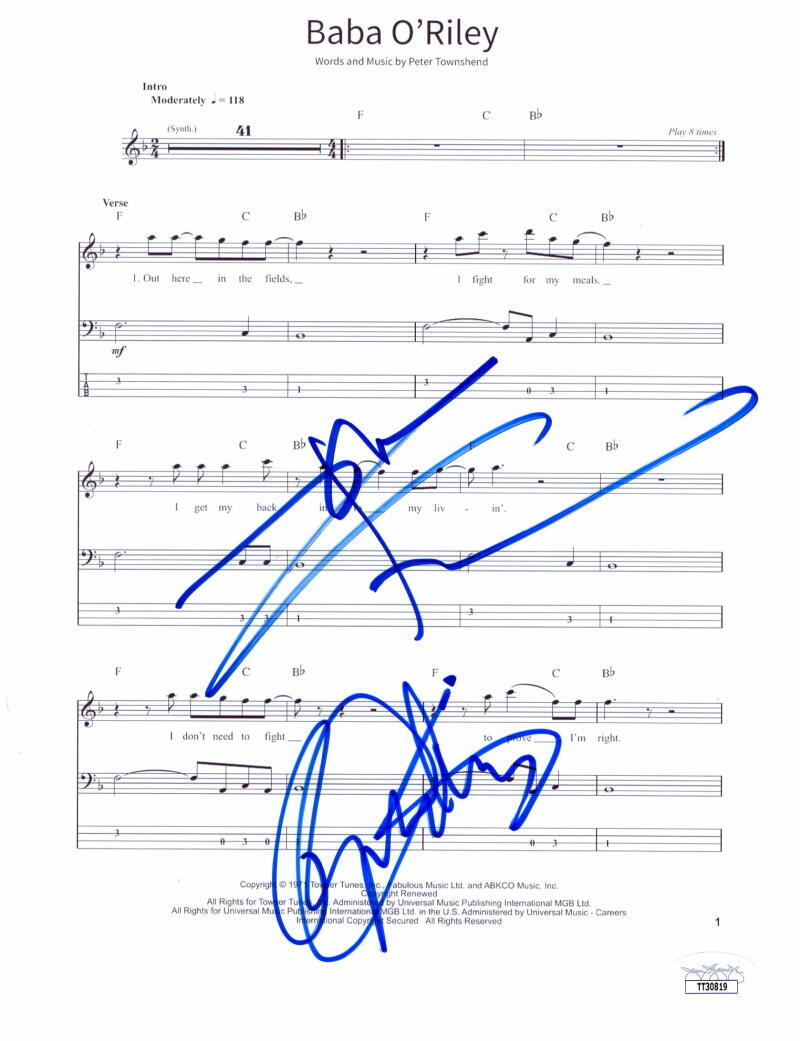 ROGER DALTREY & PETE TOWNSHEND WHO SIGNED AUTOGRAPH BABA O’RILEY SHEET MUSIC JSA COLLECTIBLE MEMORABILIA