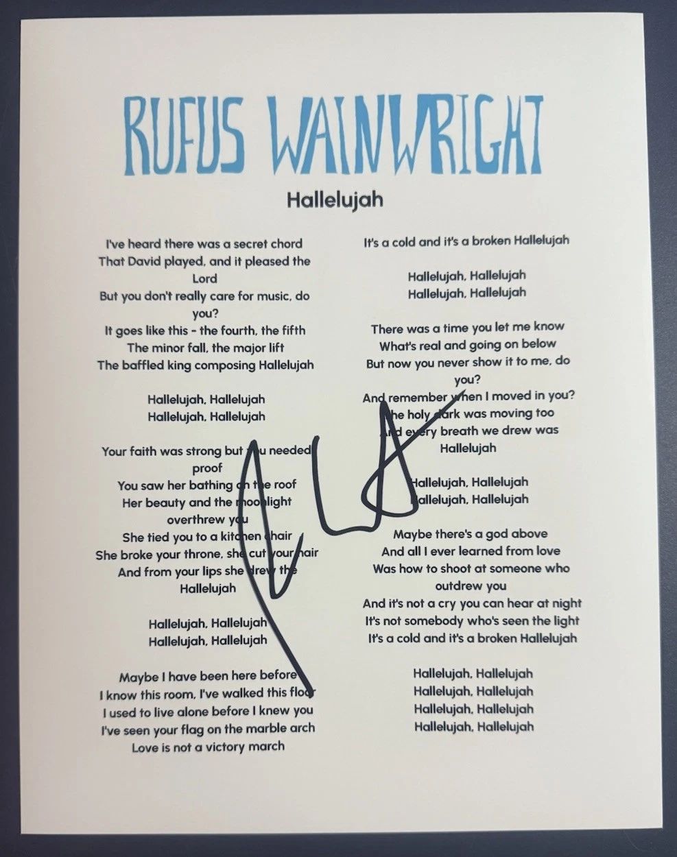 RUFUS WAINWRIGHT SIGNED LYRIC SHEET HALLELUJAH AUTHENTIC AUTOGRAPH COA COLLECTIBLE MEMORABILIA