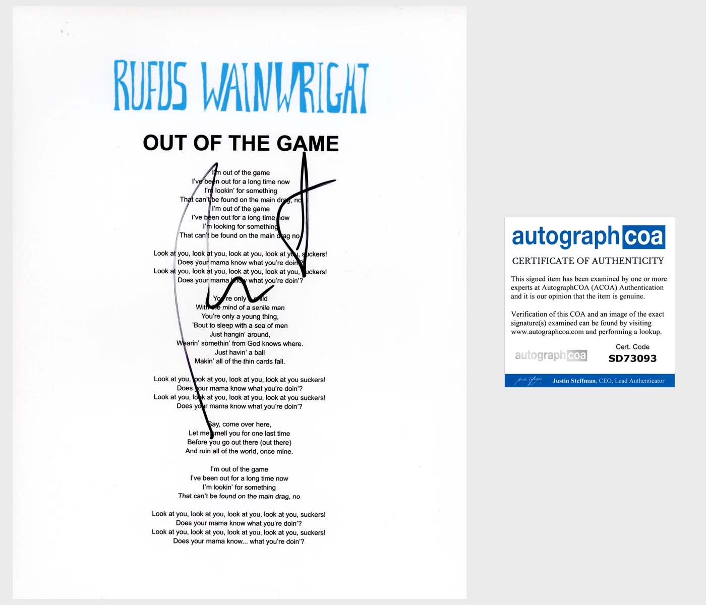 RUFUS WAINWRIGHT SIGNED OUT OF THE GAME LYRIC SHEET W/PROOF & AUTOGRAPH ACOA COA COLLECTIBLE MEMORABILIA