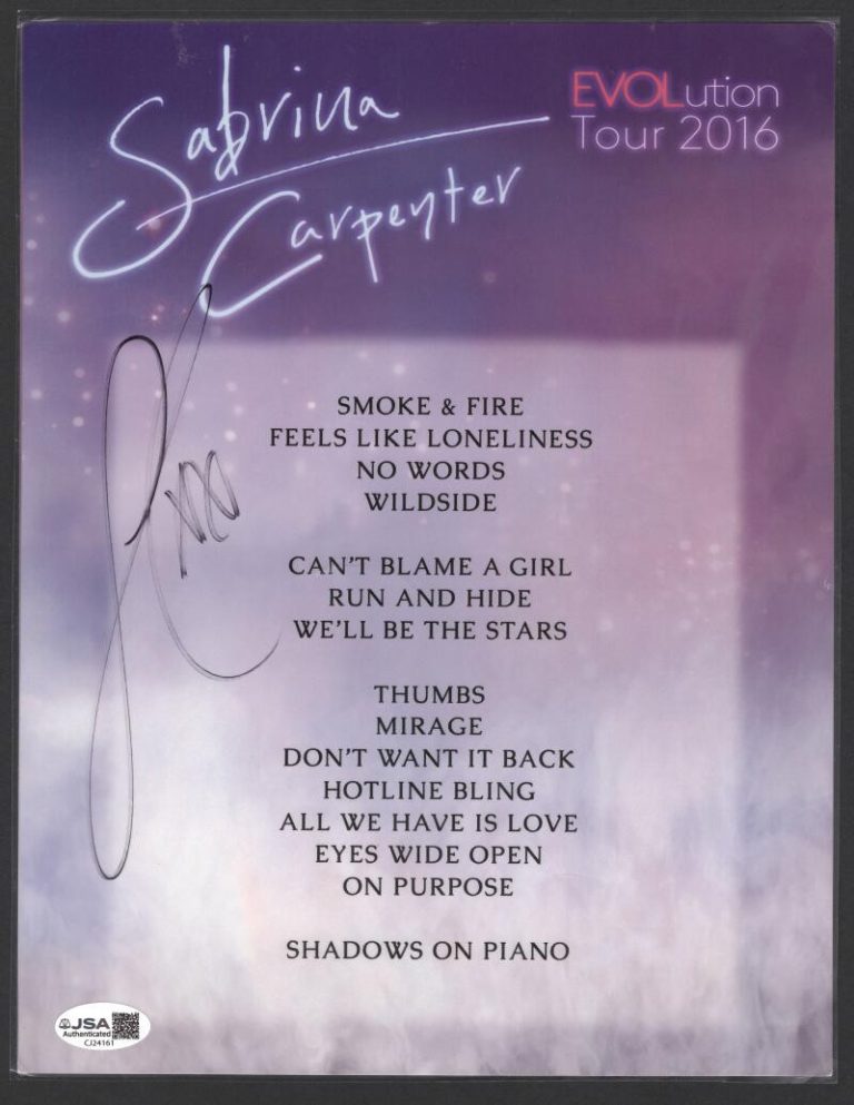 SABRINA CARPENTER SIGNED AUTOGRAPH 8.5×11 LAMINATED EVOLUTION TOUR SET LIST JSA COLLECTIBLE MEMORABILIA