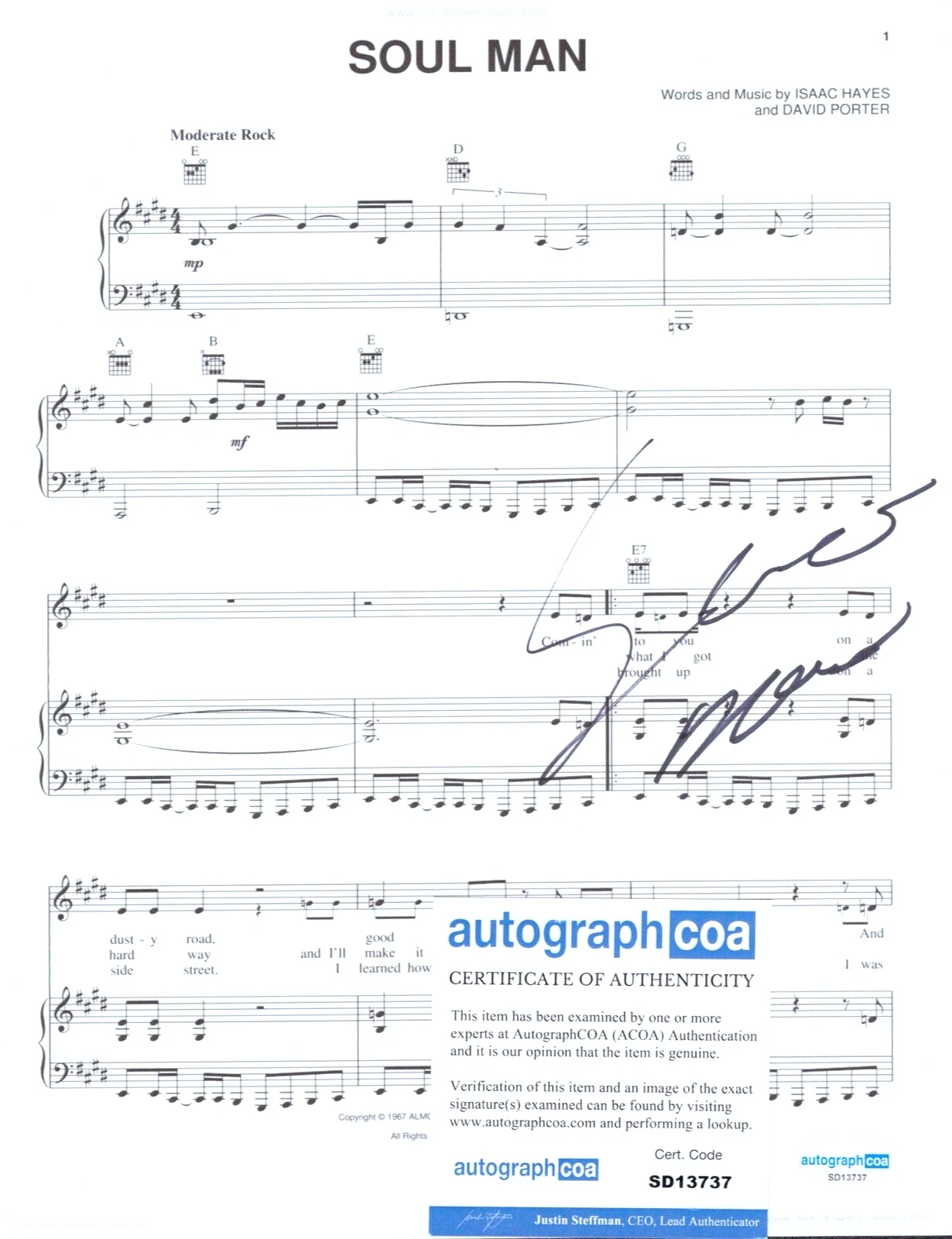 SAM MOORE SIGNED AUTO LYRIC SHEET MUSIC SOUL MAN ACOA COLLECTIBLE MEMORABILIA