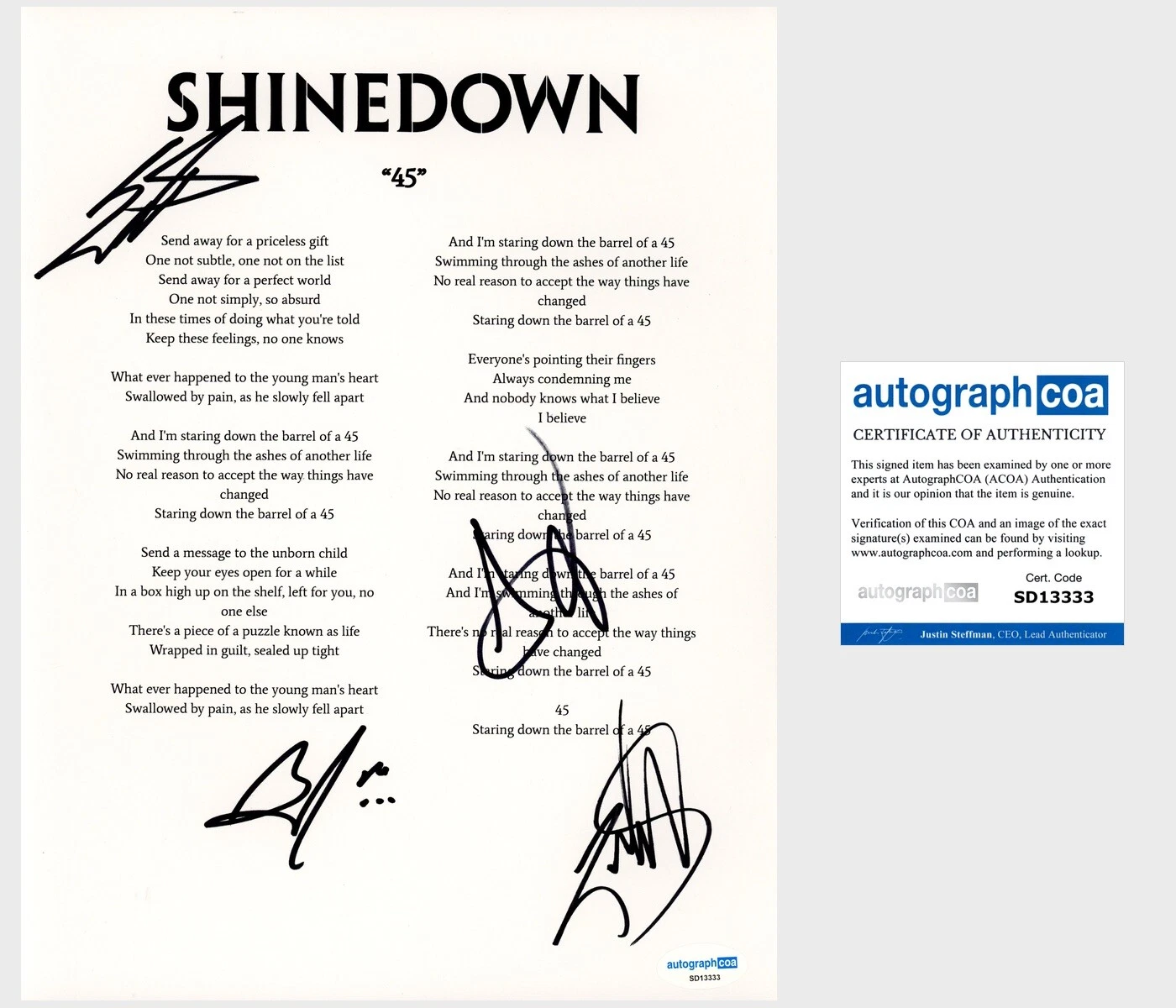 ‘SHINEDOWN’ FULL BAND SIGNED LYRIC SHEET ‘45’ BRENT SMITH +3 ACOA COLLECTIBLE MEMORABILIA