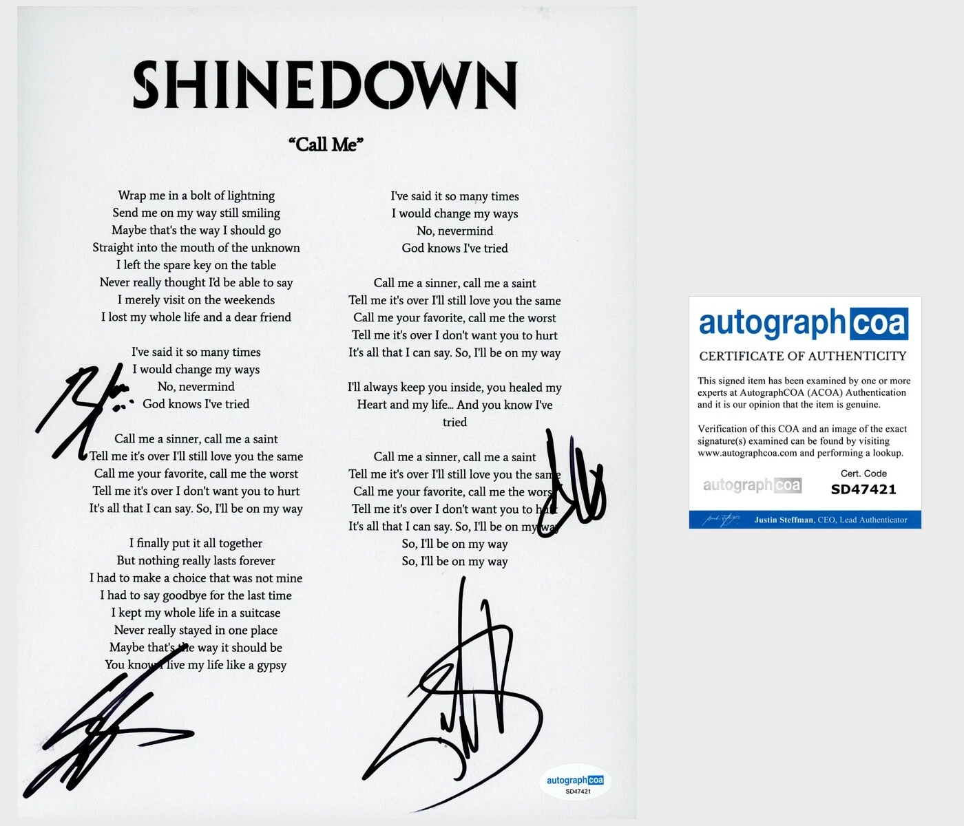 ‘SHINEDOWN’ FULL BAND SIGNED LYRIC SHEET ‘CALL ME’ BRENT SMITH +3 ACOA COLLECTIBLE MEMORABILIA