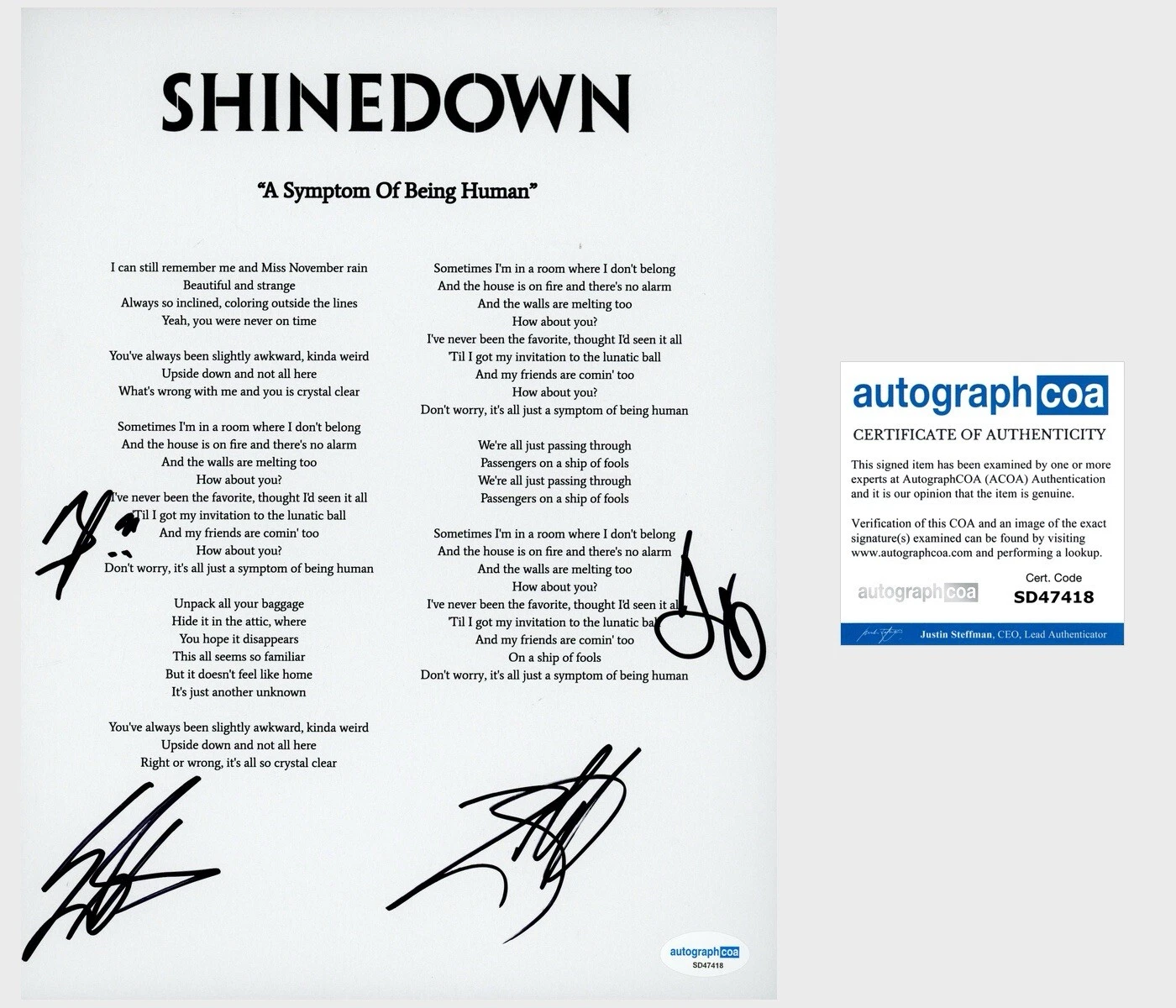 ‘SHINEDOWN’ FULL BAND SIGNED LYRIC SHEET SYMPTOM OF BEING HUMAN BRENT SMITH ACOA COLLECTIBLE MEMORABILIA