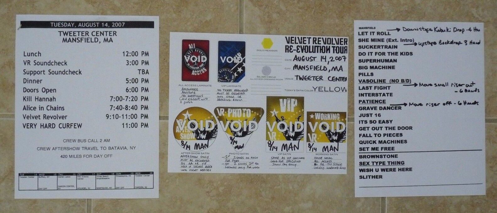 SLASH GNR VELVET REVOLVER 2007 SET LIST, CALL SHEET & BACKSTAGE PASS COPIES COLLECTIBLE MEMORABILIA