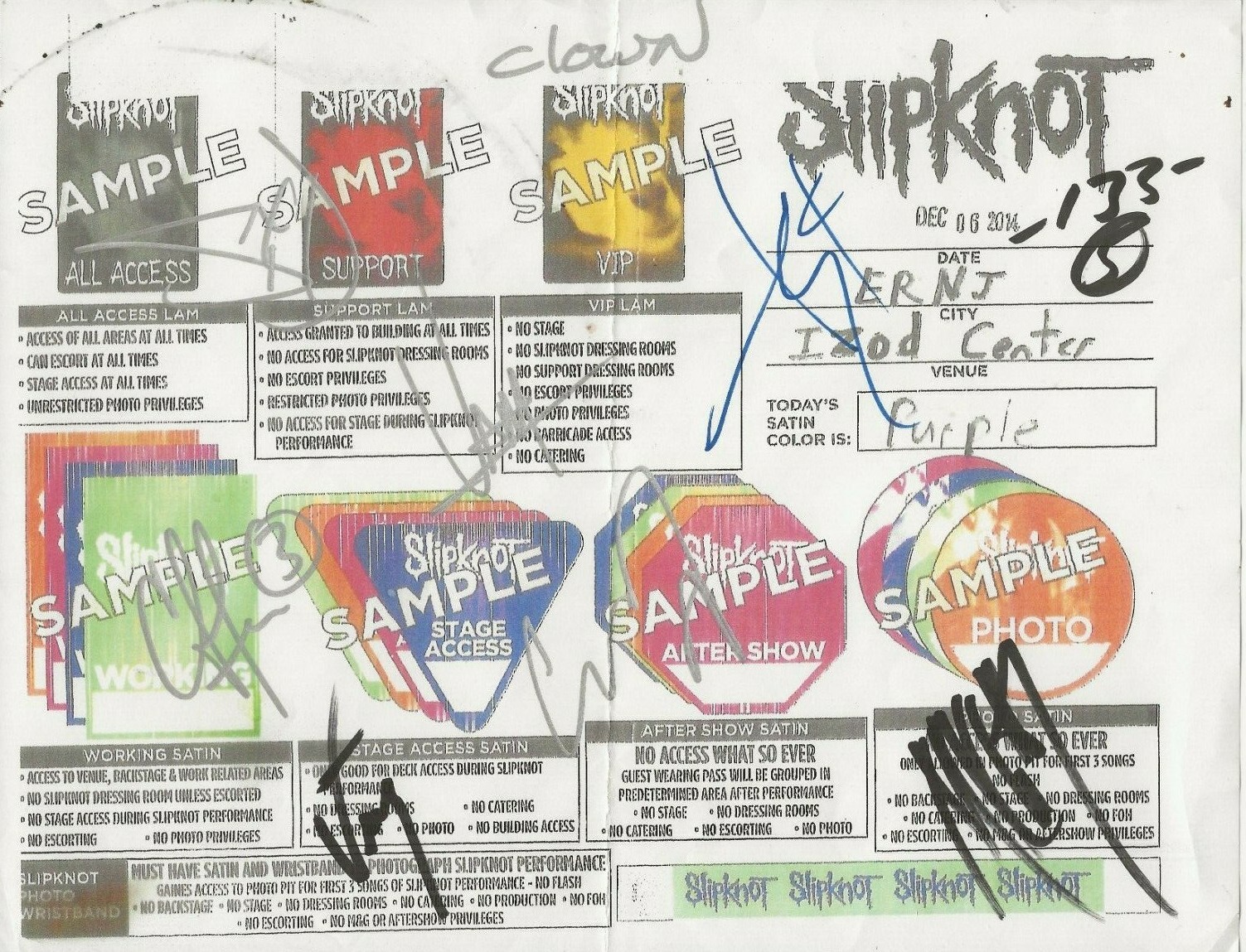 SLIPKNOT SIGNED BACKSTAGE PASS PAPER 2014 BY 9 JSA FULL LOA COREY TAYLOR COLLECTIBLE MEMORABILIA