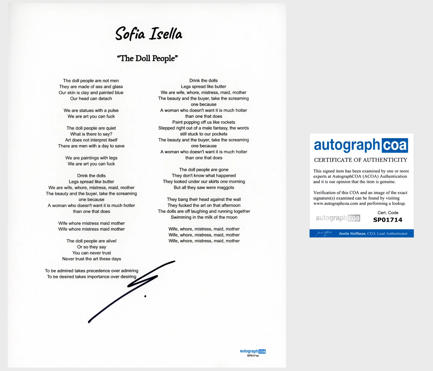 SOFIA ISELLA ‘THE DOLL PEOPLE’ SIGNED LYRIC SHEET ACOA INDIE POP SINGER COLLECTIBLE MEMORABILIA