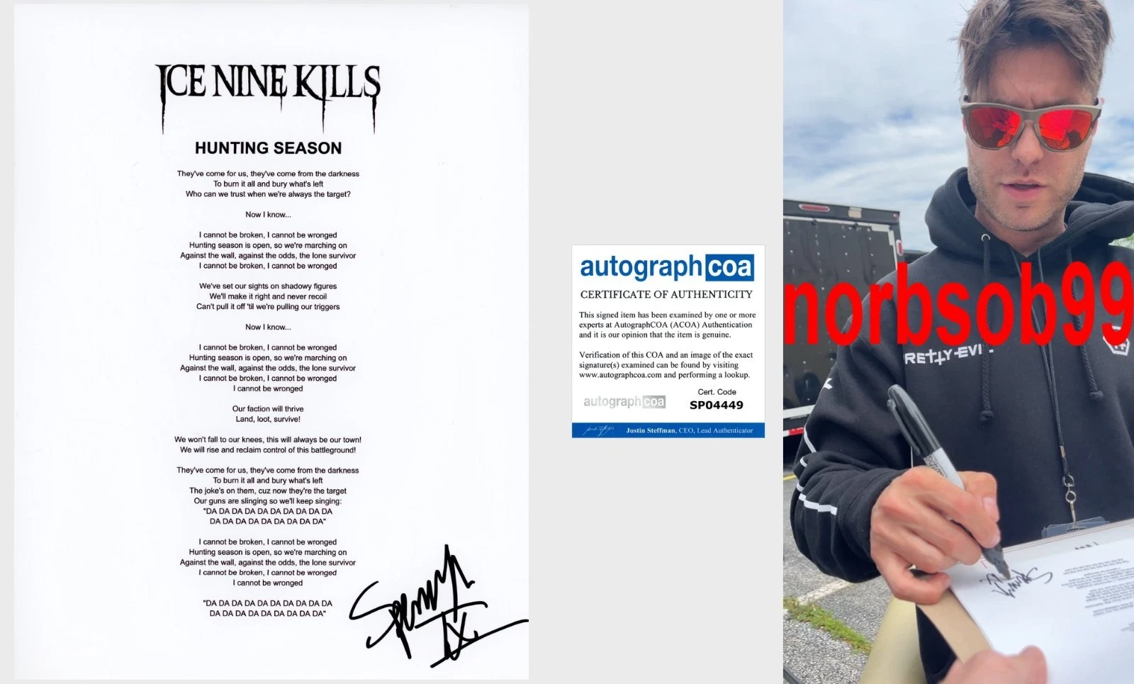 SPENCER CHARNAS SIGNED ICE NINE KILLS HUNTING SEASON LYRIC SHEET EXACT PROOF COA COLLECTIBLE MEMORABILIA