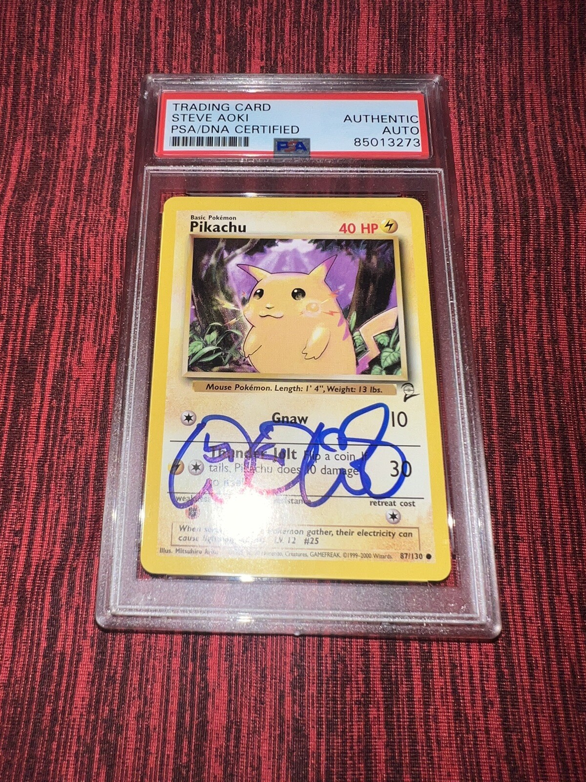 STEVE AOKI SIGNED OFFICIAL POKEMON TRADING CARD 1999 87 BASE SET 2 PIKACHU PSA COLLECTIBLE MEMORABILIA