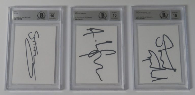STING & THE POLICE SIGNED AUTOGRAPH INDEX CARD CUT BY 3 SLAB JSA BAS 10 AUTO COLLECTIBLE MEMORABILIA