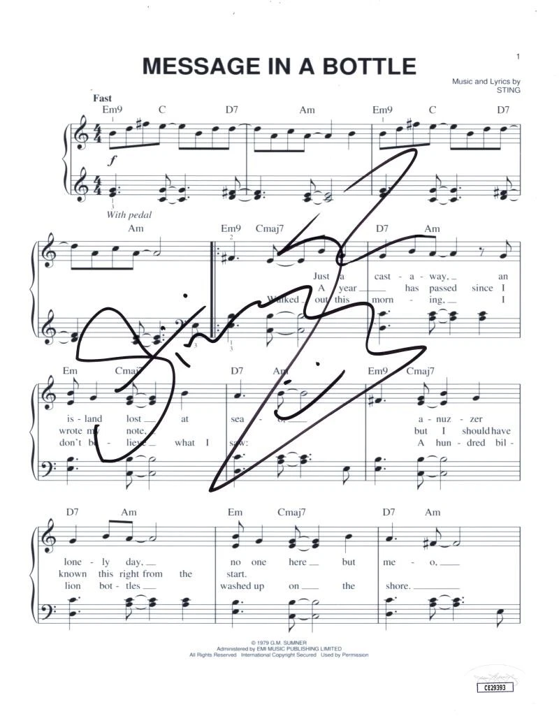 STING THE POLICE SIGNED AUTOGRAPH MESSAGE IN A BOTTLE SHEET MUSIC W/ JSA COA COLLECTIBLE MEMORABILIA