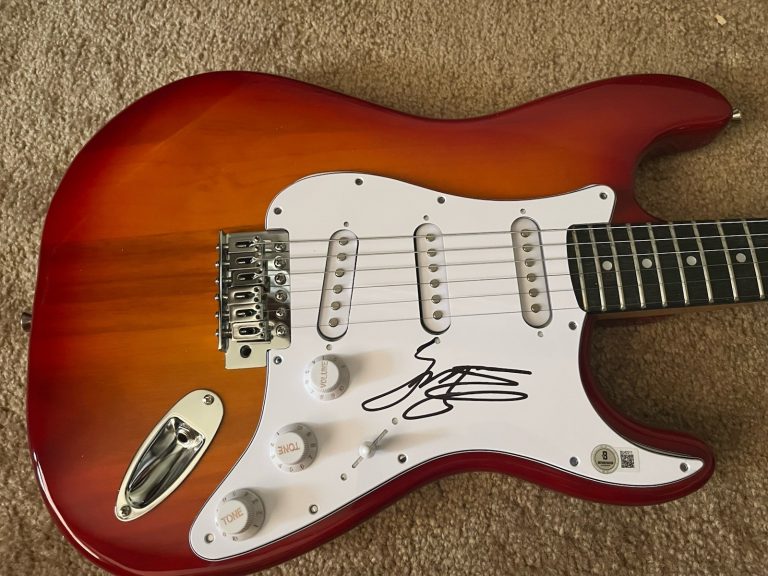 This hand-signed guitar is verified 100% genuine by professional authenticators and includes a Certificate of Authenticity card. A numbered tamper-proof hologram is attached to the item so you can verify its authenticity on our website at your convenience.