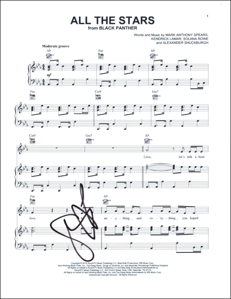 SZA SIGNED AUTOGRAPH ALL THE STARS SHEET MUSIC W/ KENDRICK LAMAR BLACK PANTHER COLLECTIBLE MEMORABILIA