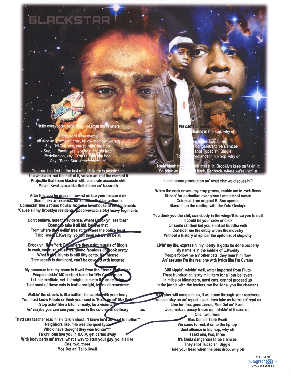 TALIB KWELI SIGNED BLACK STAR DEFINITION LYRIC SHEET RAPPER MOS DEF ACOA COA COLLECTIBLE MEMORABILIA