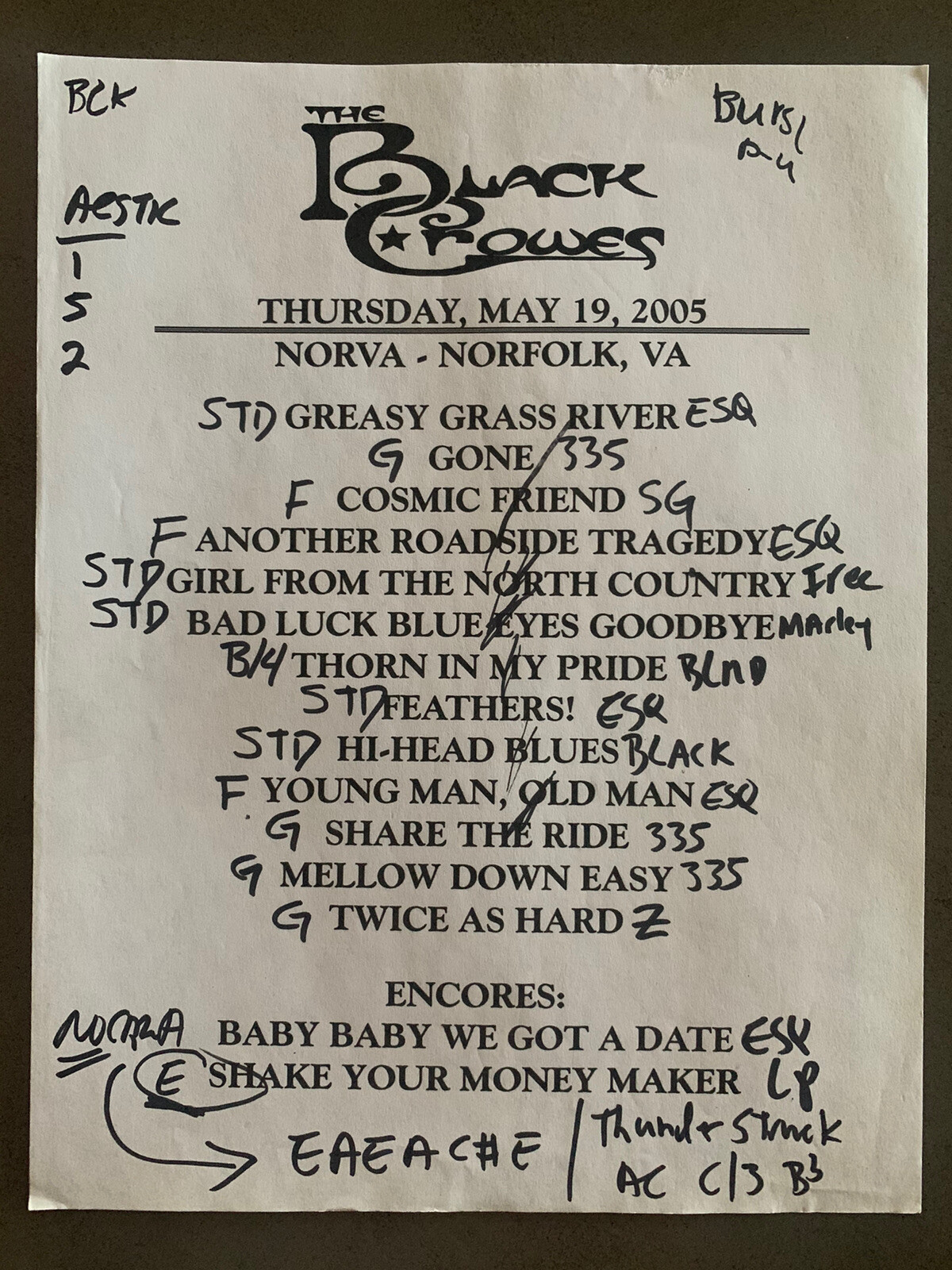 THE BLACK CROWES 5-19-05 TOUR CONCERT USED SET LIST W/ NOTES NORFOLK, VA COLLECTIBLE MEMORABILIA