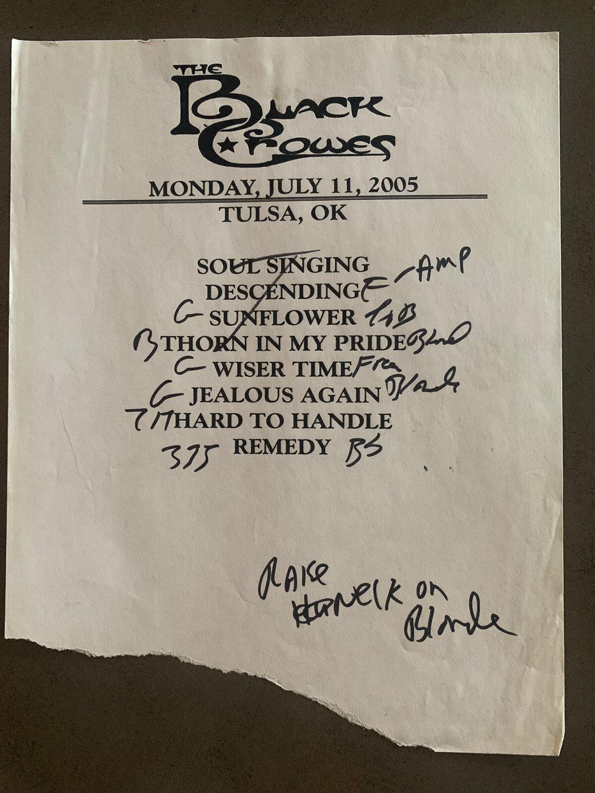 THE BLACK CROWES 7-11-05 TOUR CONCERT USED SET LIST W/ NOTES TULSA, OK COLLECTIBLE MEMORABILIA