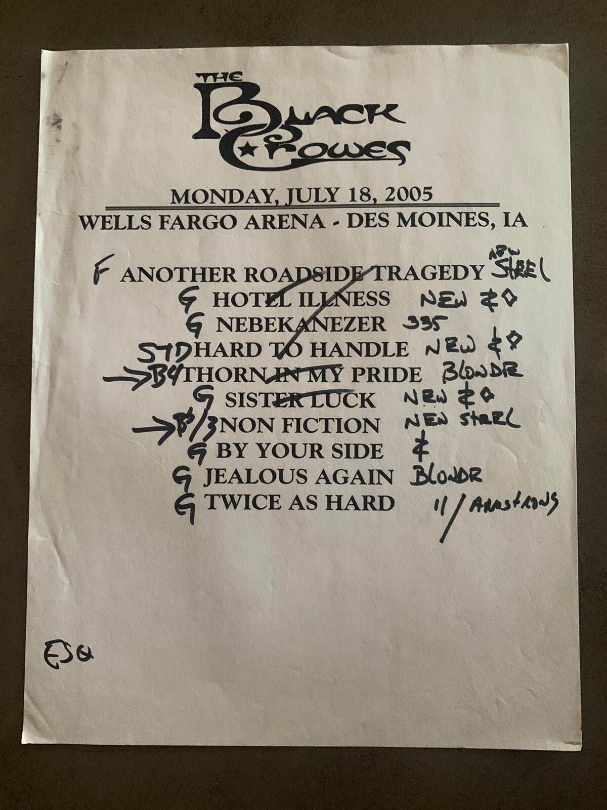 THE BLACK CROWES 7-18-05 TOUR CONCERT USED SET LIST W/ NOTES DES MOINES, IA COLLECTIBLE MEMORABILIA