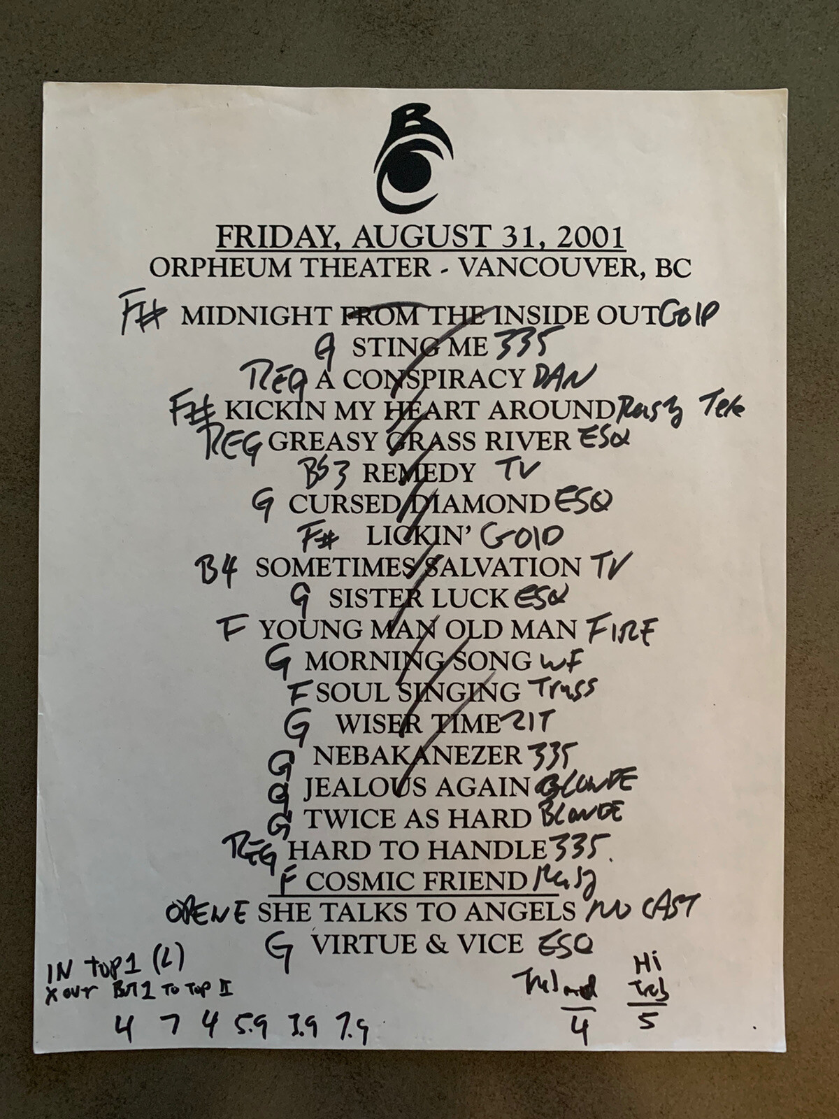 THE BLACK CROWES 8-31-01 TOUR CONCERT USED SET LIST W/ NOTES VANCOUVER, BC COLLECTIBLE MEMORABILIA