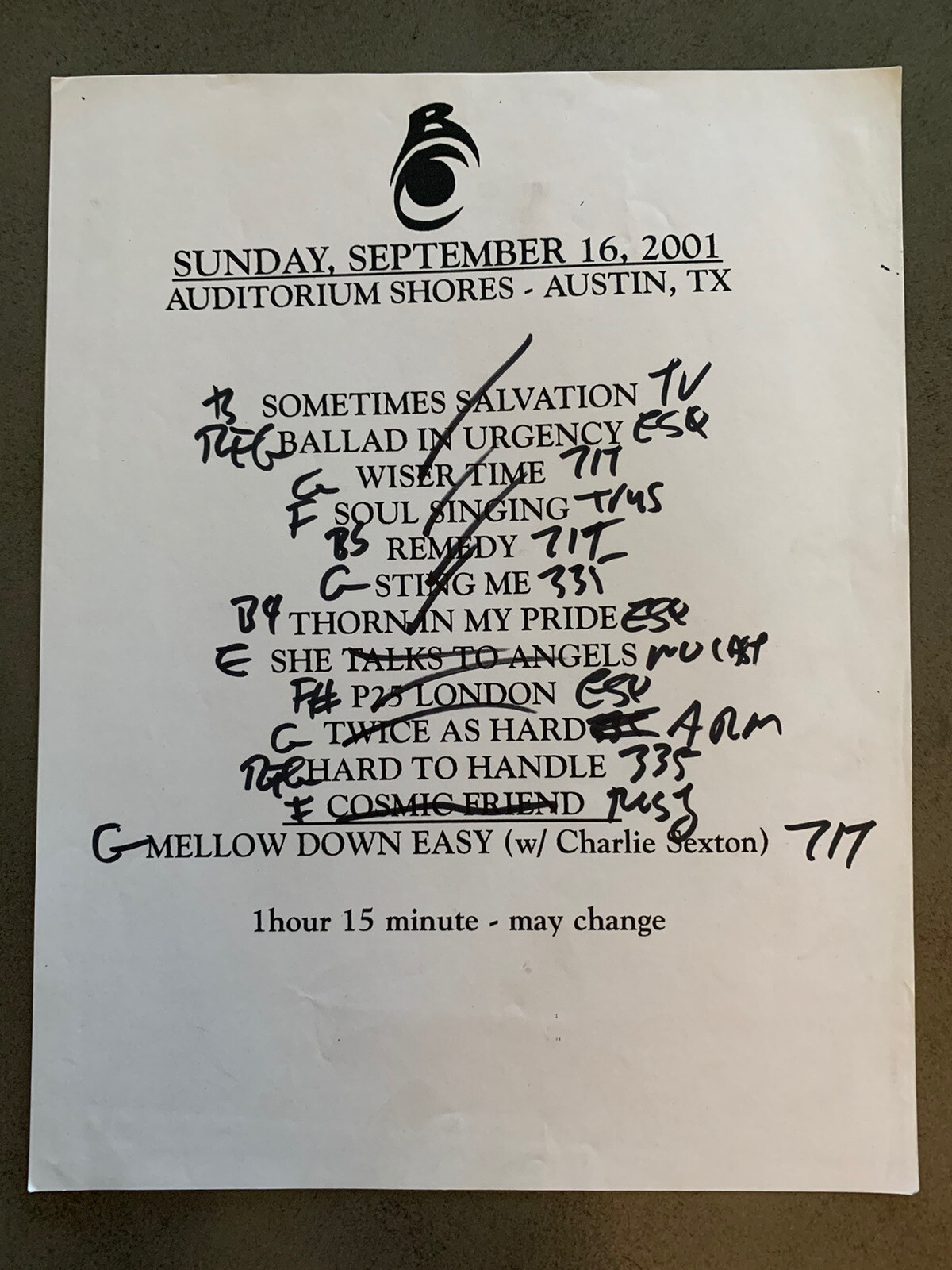 THE BLACK CROWES 9-16-01 TOUR CONCERT USED SET LIST W/ NOTES AUSTIN, TX COLLECTIBLE MEMORABILIA
