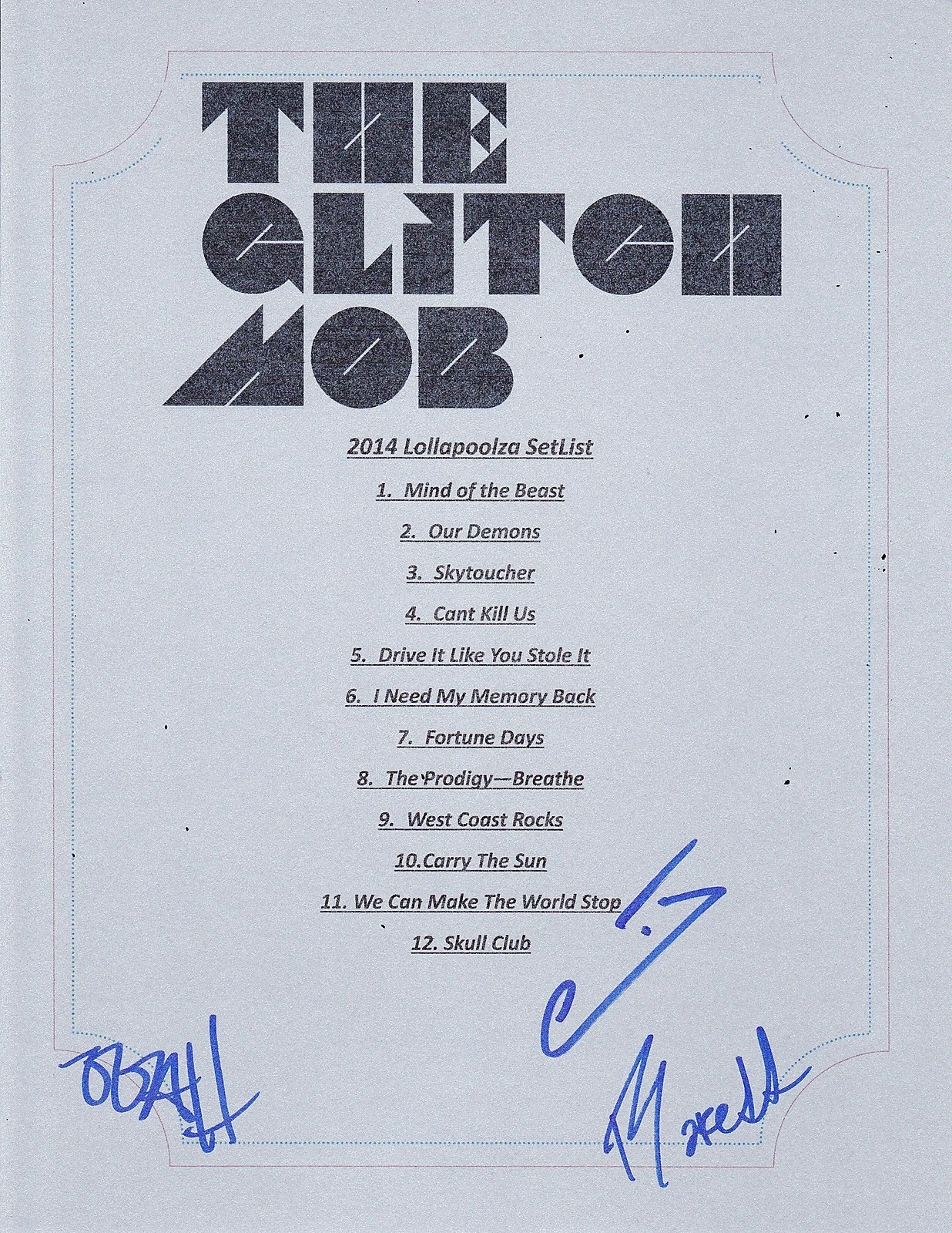 THE GLITCH MOB GROUP SIGNED 2014 LOLLAPOOLZA SET LIST COLLECTIBLE MEMORABILIA
