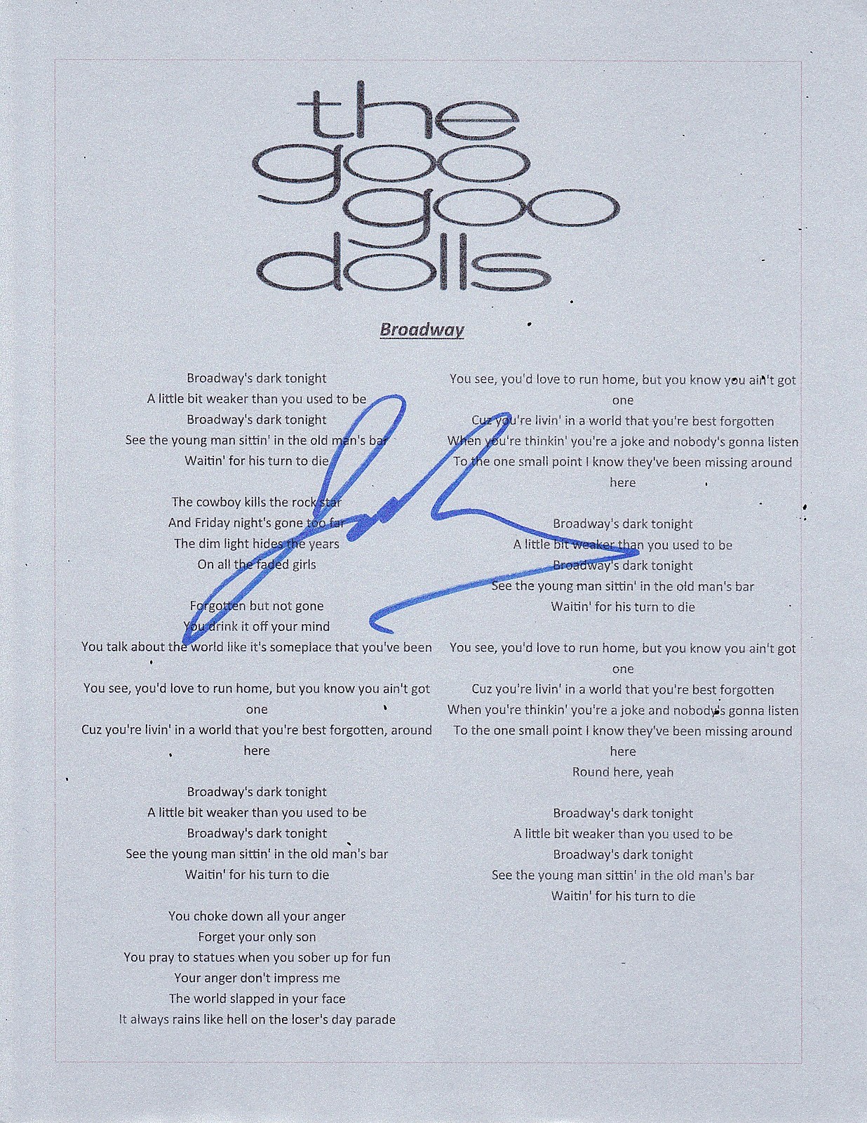 THE GOO GOO DOLLS JOHN RZEZNIK SIGNED BROADWAY LYRIC SHEET COLLECTIBLE MEMORABILIA