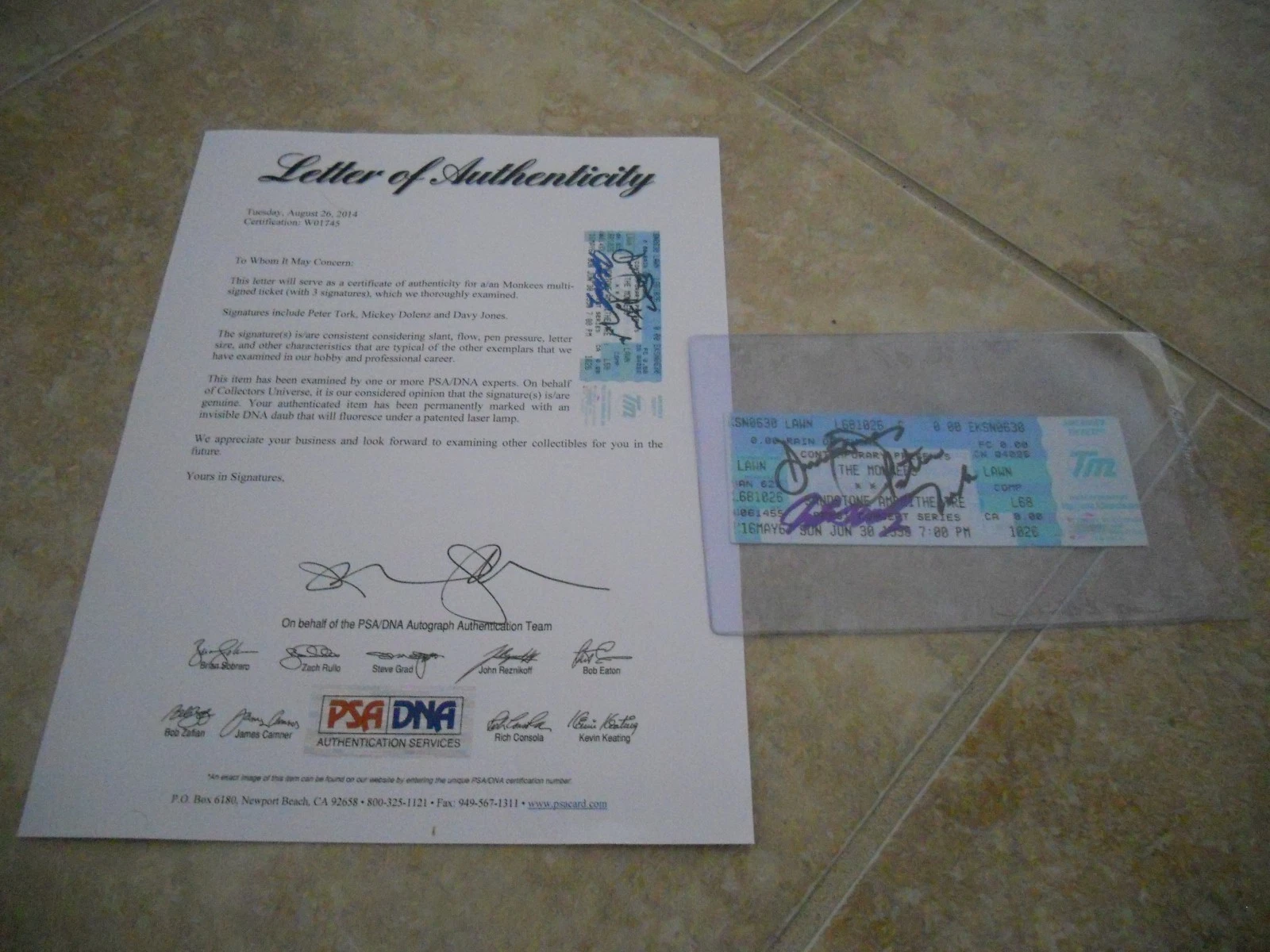 THE MONKESS TORK DOLENZ JONES SIGNED AUTOGRAPH CONCERT TICKET STUB PSA CERTIFIED COLLECTIBLE MEMORABILIA