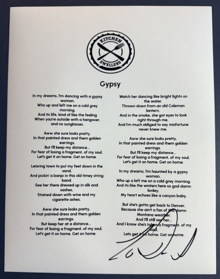 TORRIN DANIELS SIGNED LYRIC SHEET GYPSY KITCHEN DWELLERS AUTOGRAPH AUTHENTIC COA COLLECTIBLE MEMORABILIA