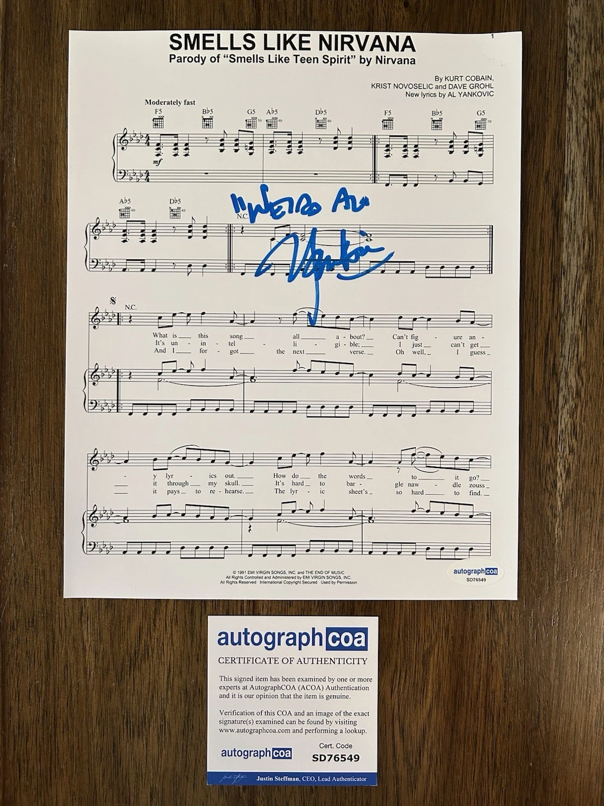 ‘WEIRD AL YANKOVIC’ PARODY SINGER SIGNED ‘SMELLS LIKE NIRVANA’ SHEET MUSIC ACOA COLLECTIBLE MEMORABILIA
