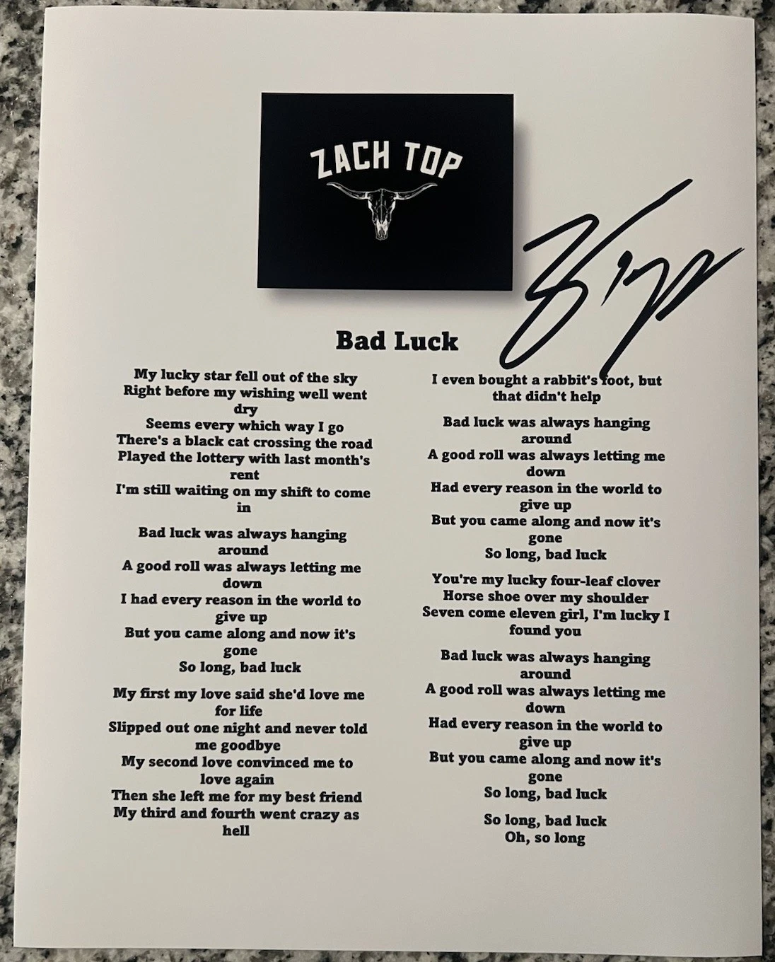 ZACH TOP SIGNED LYRIC SHEET BAD LUCK AUTHENTIC AUTOGRAPH COUNTRY SINGER COA COLLECTIBLE MEMORABILIA