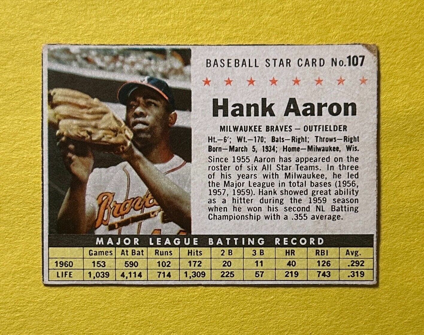 1961 POST HANK AARON BASEBALL STAR CARD #107 BRAVES HOF COLLECTIBLE MEMORABILIA