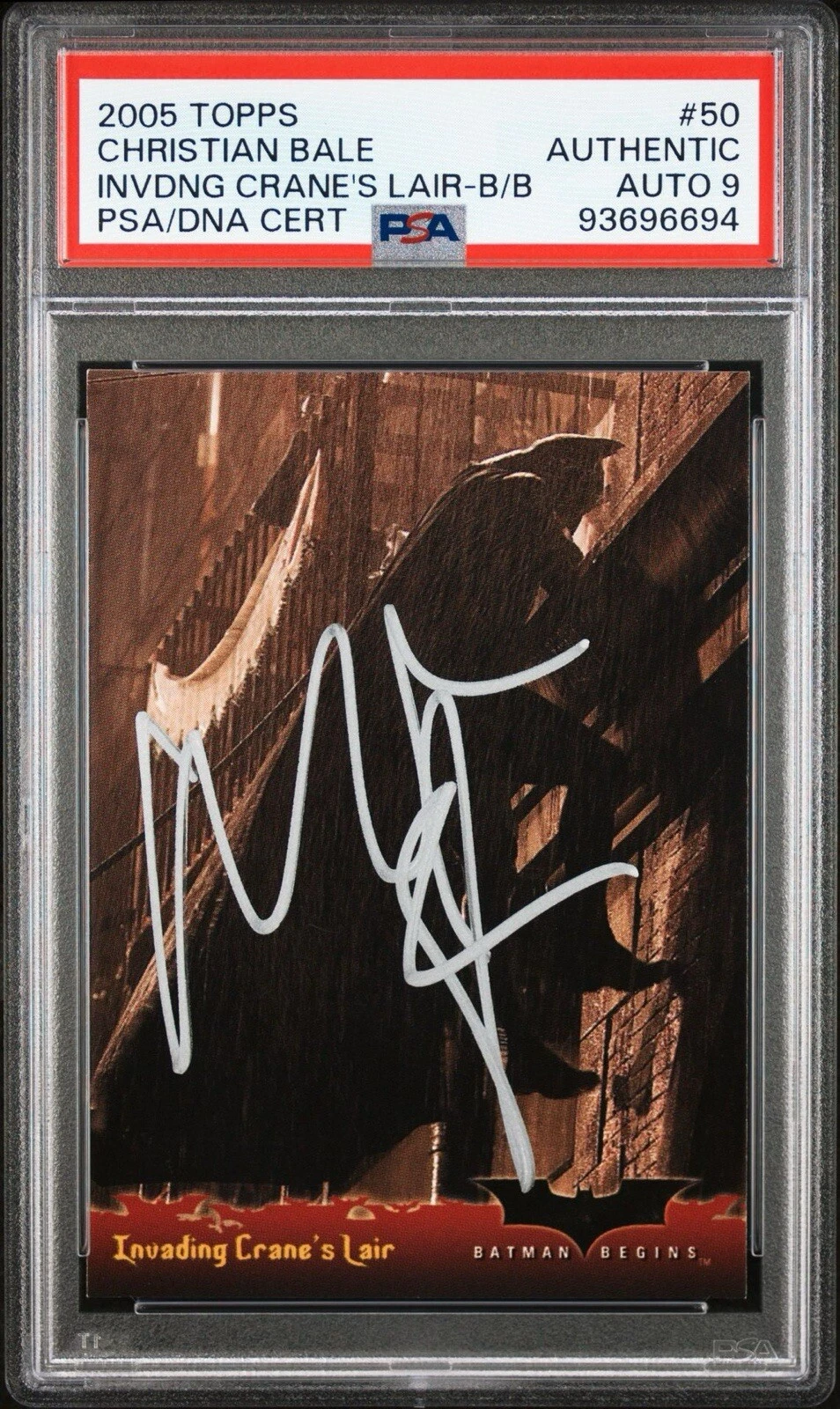 2005 TOPPS #50 CHRISTIAN BALE SIGNED BATMAN BEGINS ROOKIE CARD PSA MINT 9 AUTO COLLECTIBLE MEMORABILIA