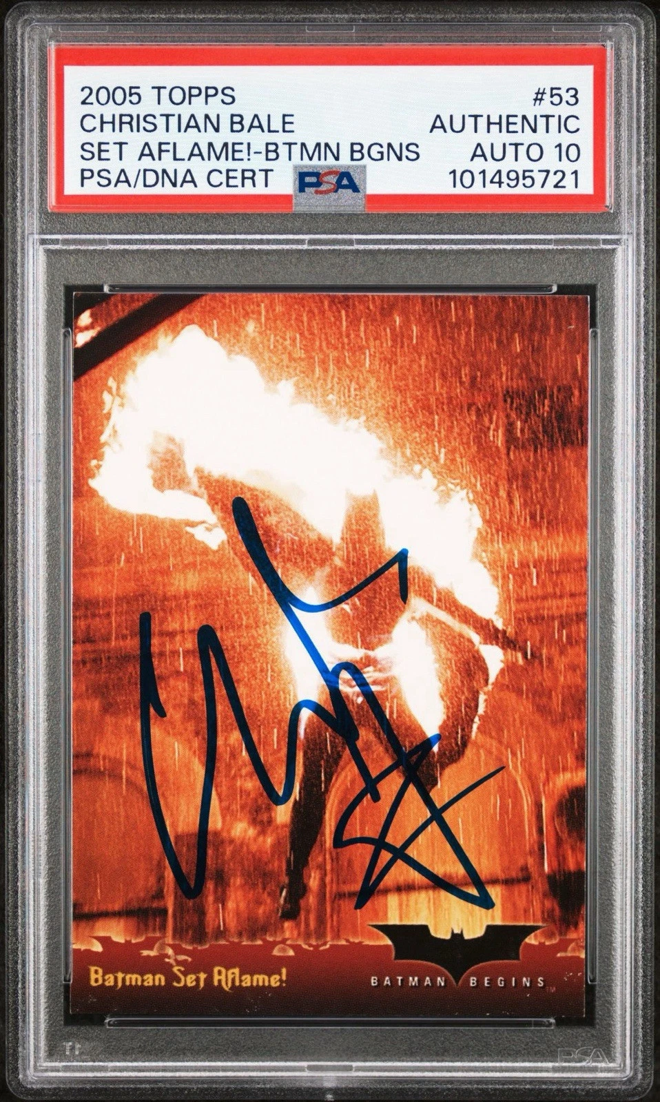 2005 TOPPS BATMAN BEGINS #53 CHRISTIAN BALE AFLAME! ROOKIE CARD PSA GEM 10 AUTO COLLECTIBLE MEMORABILIA